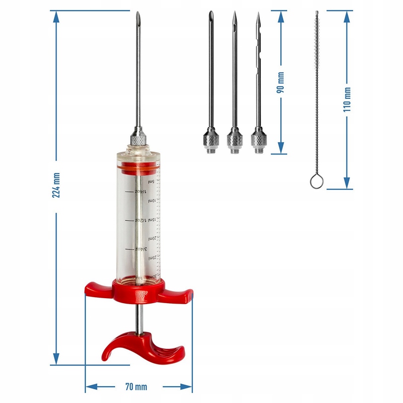 В комплект входят три разные иглы-дозаторы: одна с широким горлышком на конце лезвия, вторая с боковым отверстием и третья с четырьмя боковыми. отверстия. Для инъецирования более крупных кусков мяса используйте иглы с боковыми отверстиями.