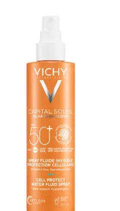 Vichy Capital Soleil Cell Protect UV Protective Body Spray SPF50+, 200 мл — косметическое средство с ультралегкой формулой, создающее усовершенствованный защитный слой от УФ-излучения с невидимым покрытием и без белых пятен, очень устойчивый к воде, песку и поту.