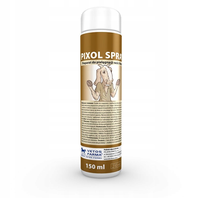 PIXOL SPRAY 150 мл – препарат для копыт и ухода за копытами. Спрей, который можно применять местно, – это современный препарат для ухода за копытами и копытами. Активное вещество – зубной камень – вместе с растворяющим средством проникает непосредственно в верхние слои эпидермиса, над которыми сразу же образуется полиэтиленовая пленка. Это увеличивает существенность местного действия препарата по сравнению с современными традиционными методами перевязки и ускоряет заживление ран. Препарат следует применять для ухода за поверхностными ссадинами, дефектами копыт, гниением роговой подушки, поверхностной распорки, постоянного ухода за копытами, укрепления копыт и копытных повязок, закрывающих повязок.