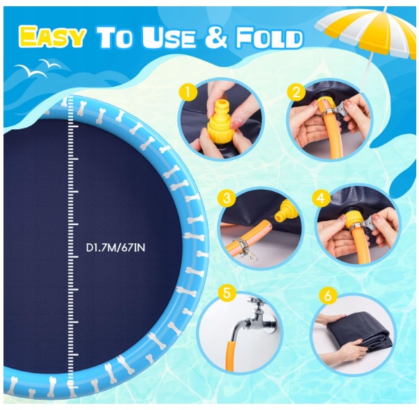 - Безопасный и размер - средний распылительный коврик для домашних животных диаметром 170 см безопасен для того, чтобы домашние животные могли играть из -за отсутствия BPA и фталатов. Обеспечивает достаточно места для маленьких и средних собак.