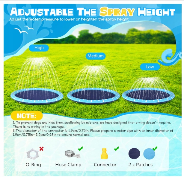 Легкая установка. Комплект включает в себя 1 x мат для разбрызгивающих домашних животных, поставляемых 3 типами аксессуаров: 1 x зажим змеи, 1 x желтого разъема, 2 x рисунка. Подключите водопроводную трубу, чтобы использовать ее. Вы должны ознакомиться с инструкциями по установке (может быть недоступно на лаке). Отрегулируйте давление воды, чтобы увеличить или уменьшить высоту потока брызги для забавных водных занятий.