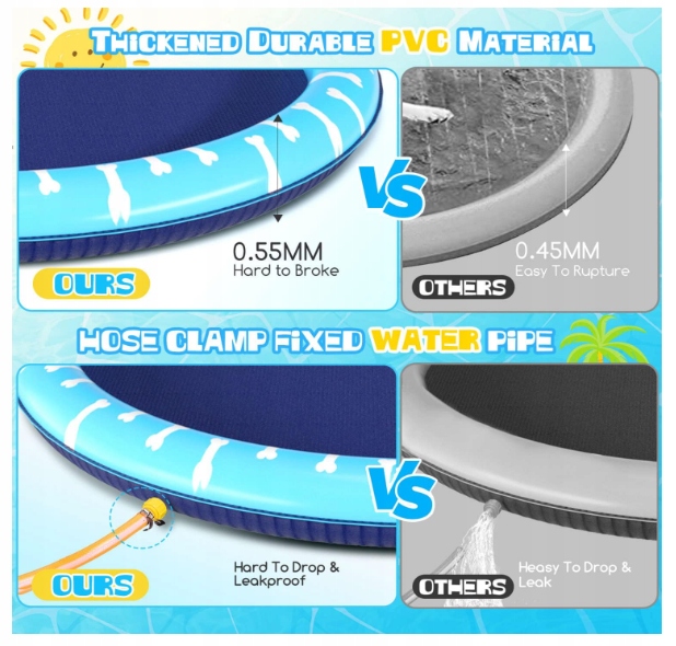 Для активности на открытом воздухе и советов. Коврик для воды подходит для сада, на газоне, садовых игрушках, бассейнах, водной воде. Совет: 1. Все продукты-это улучшенная модель 2024 без уплотнительного кольца. 2. Чтобы продлить жизнь бассейна для собак, укоренить ногти вашей собаки перед использованием. 3. Не кладите аэрозольный коврик на высокую температуру или острые предметы.