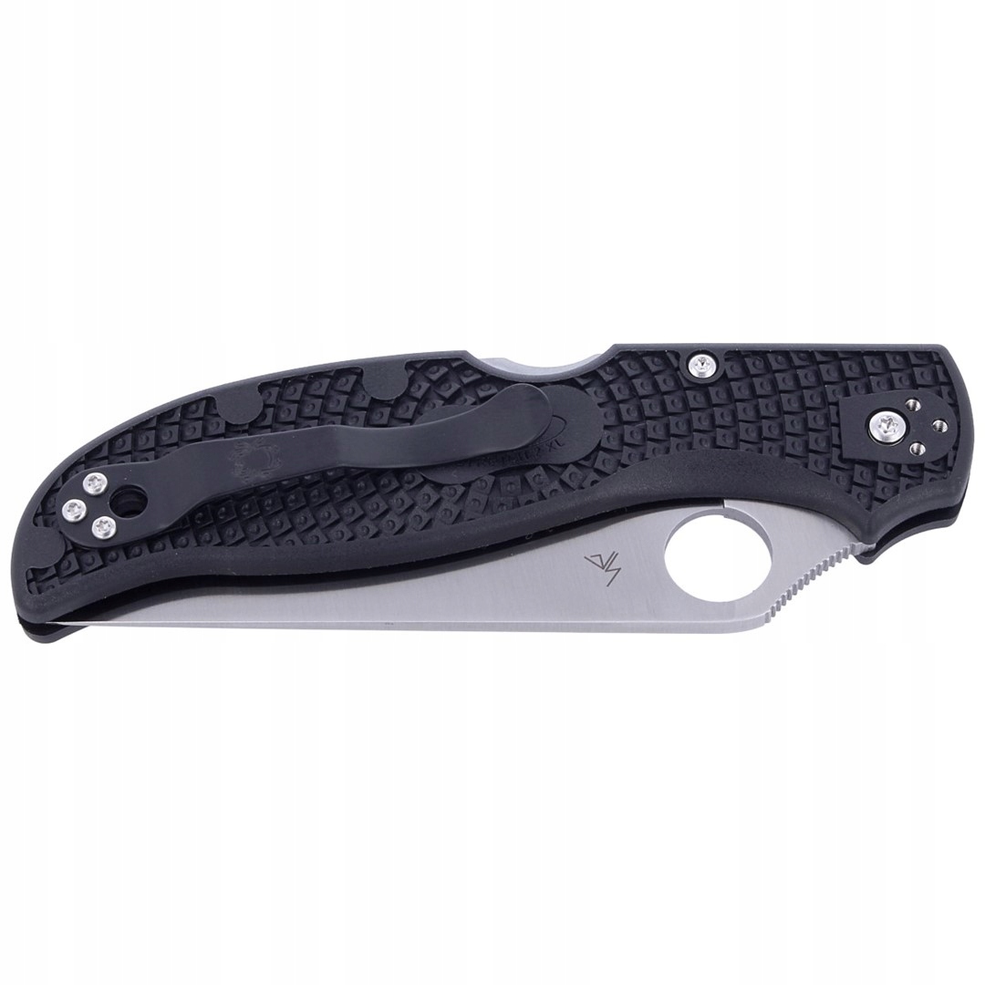 с прямой проливной , толщиной 3 мм. изготовлен из японской нержавеющей стали vg-10 (высокая устойчивость к истиранию и механическому повреждению), закаленная в диапазоне 59-61 HRC. Гладкое лезвие plain вывела с плоским разрезом (полная плоская шлифовка). Этот разрезак уменьшил массу ножа и улучшил режущие свойства. Круглый вырез spyderhole (Patent Spyderco) позволяет папке открываться в перчатках. Solid задний блокировок с дополнительным вырезанным Boye Devent, , чтобы предотвратить случайное выброс блокировки лезвия с сильным захватом ножа. Карбонированный рампа под большим пальцем и pinger Chail профилированный подрез под указательным пальцем между ручкой и режущей кромкой облегчает контроль над ножом.
