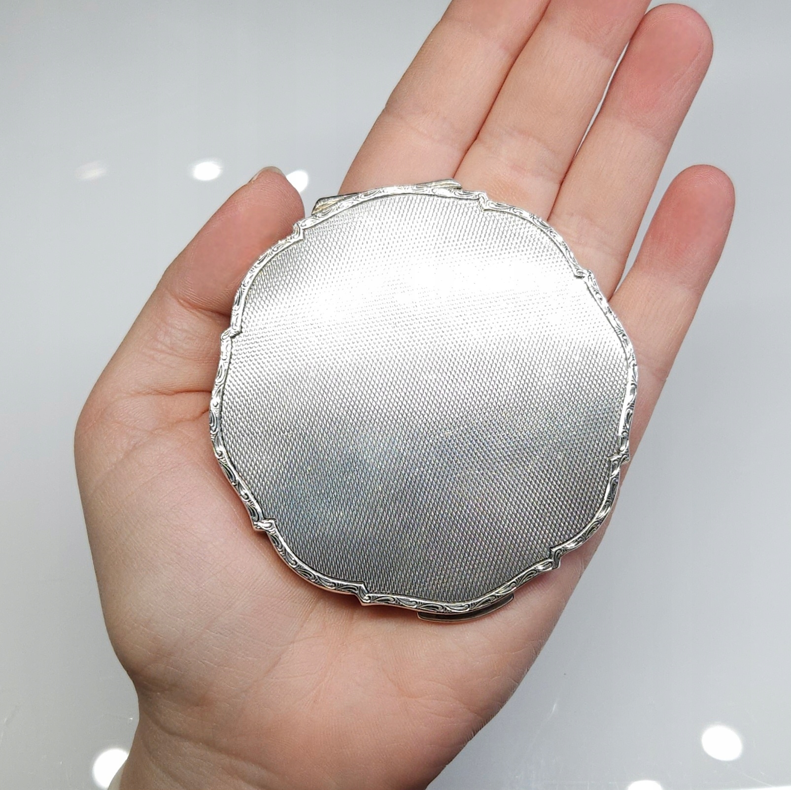 Предмет продажи серебряная пудреница-зеркало, декорированная в технике гильоширование, с нежным декоративным орнаментом