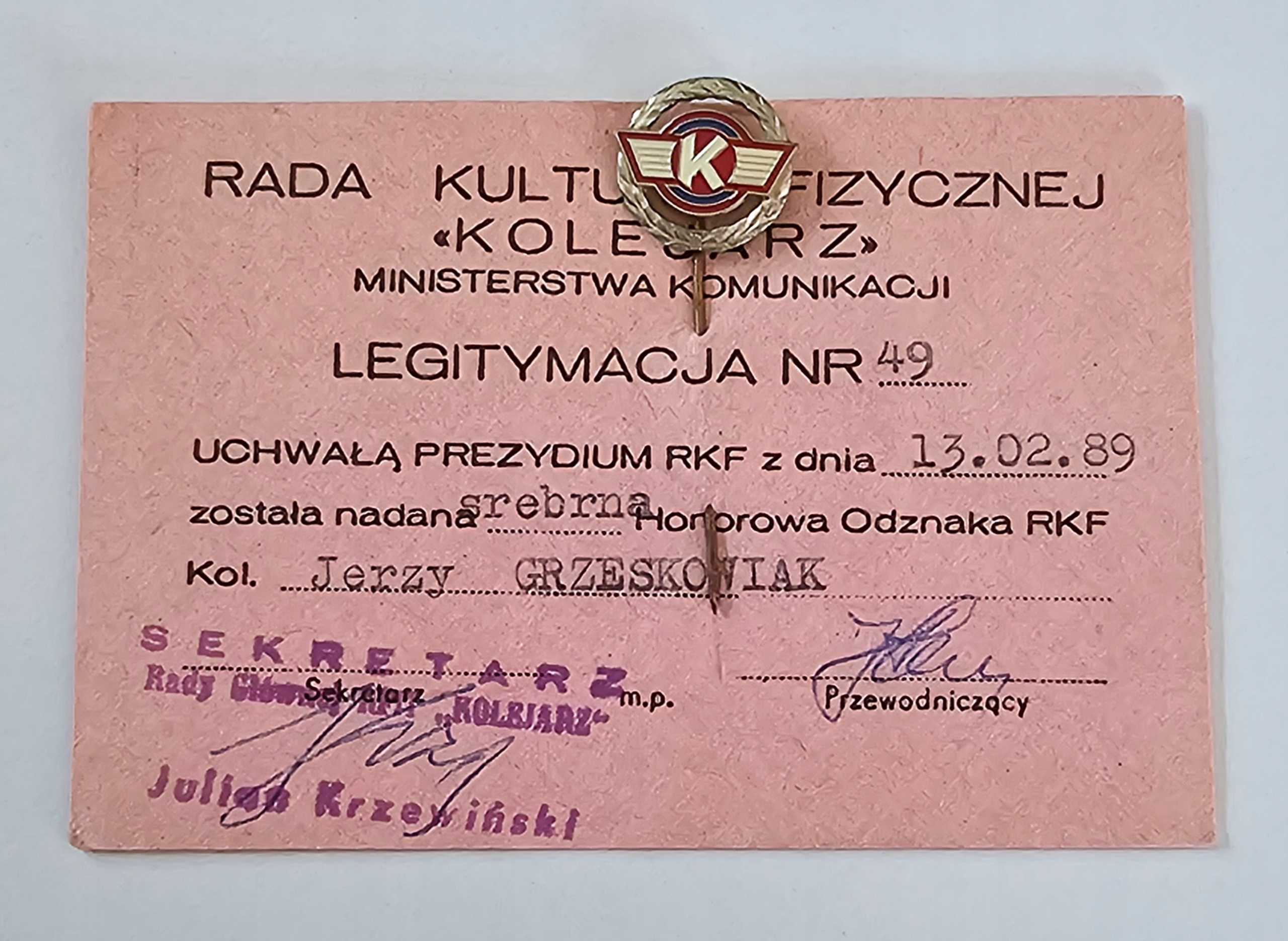 SREBRNA HONOROWA ODZNAKA KOLEJARZ PLUS NADANIE