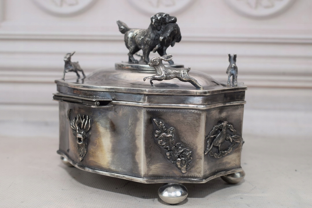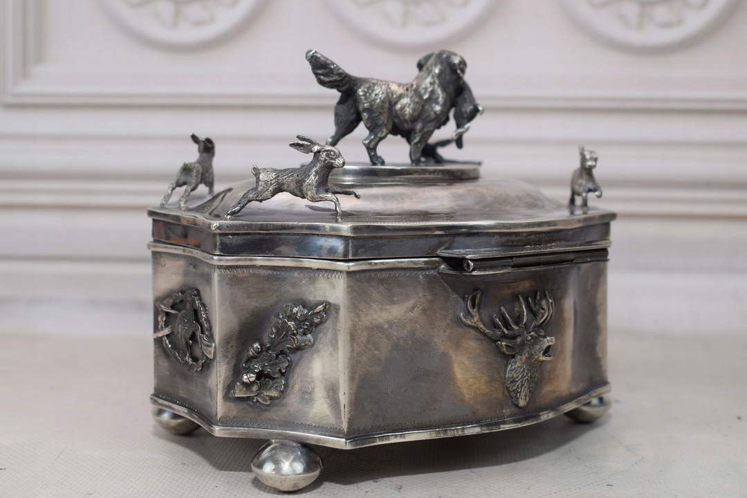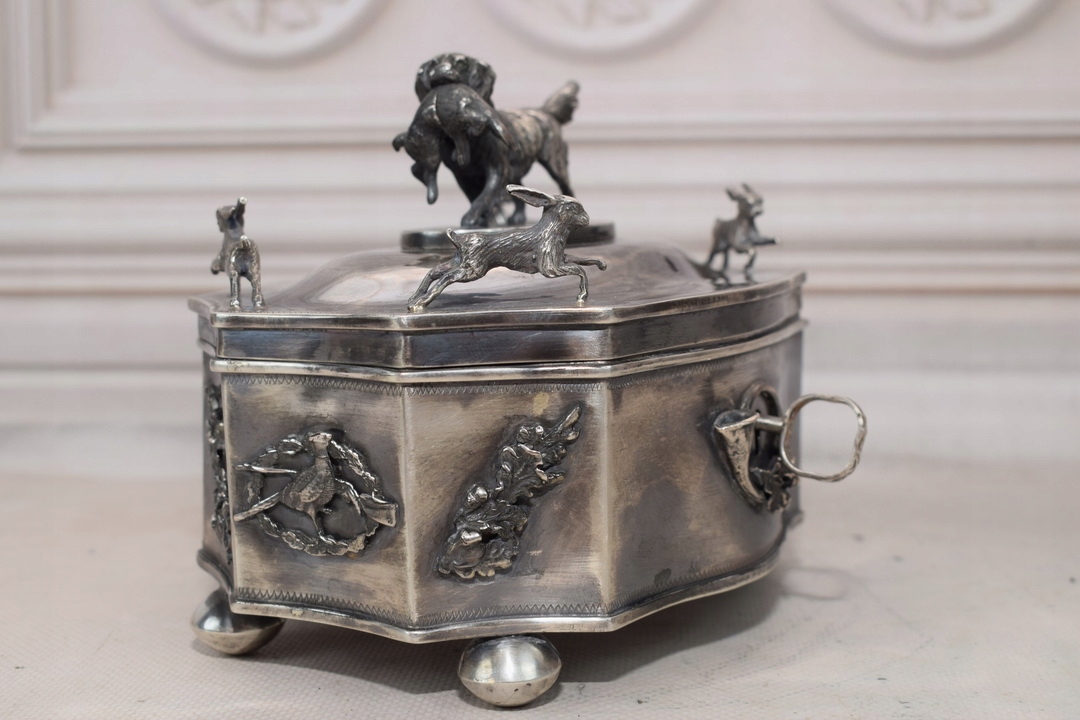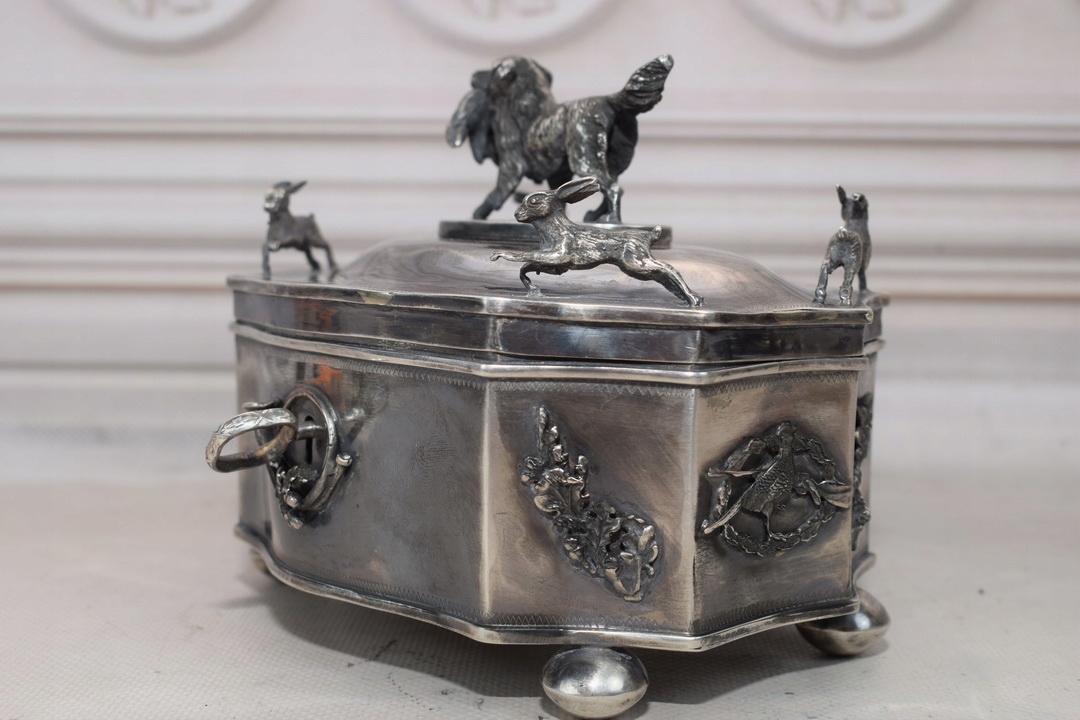 Srebrna Myśliwska Cukiernica - Pies z Kaczka - Carska Rosja 84 Srebro