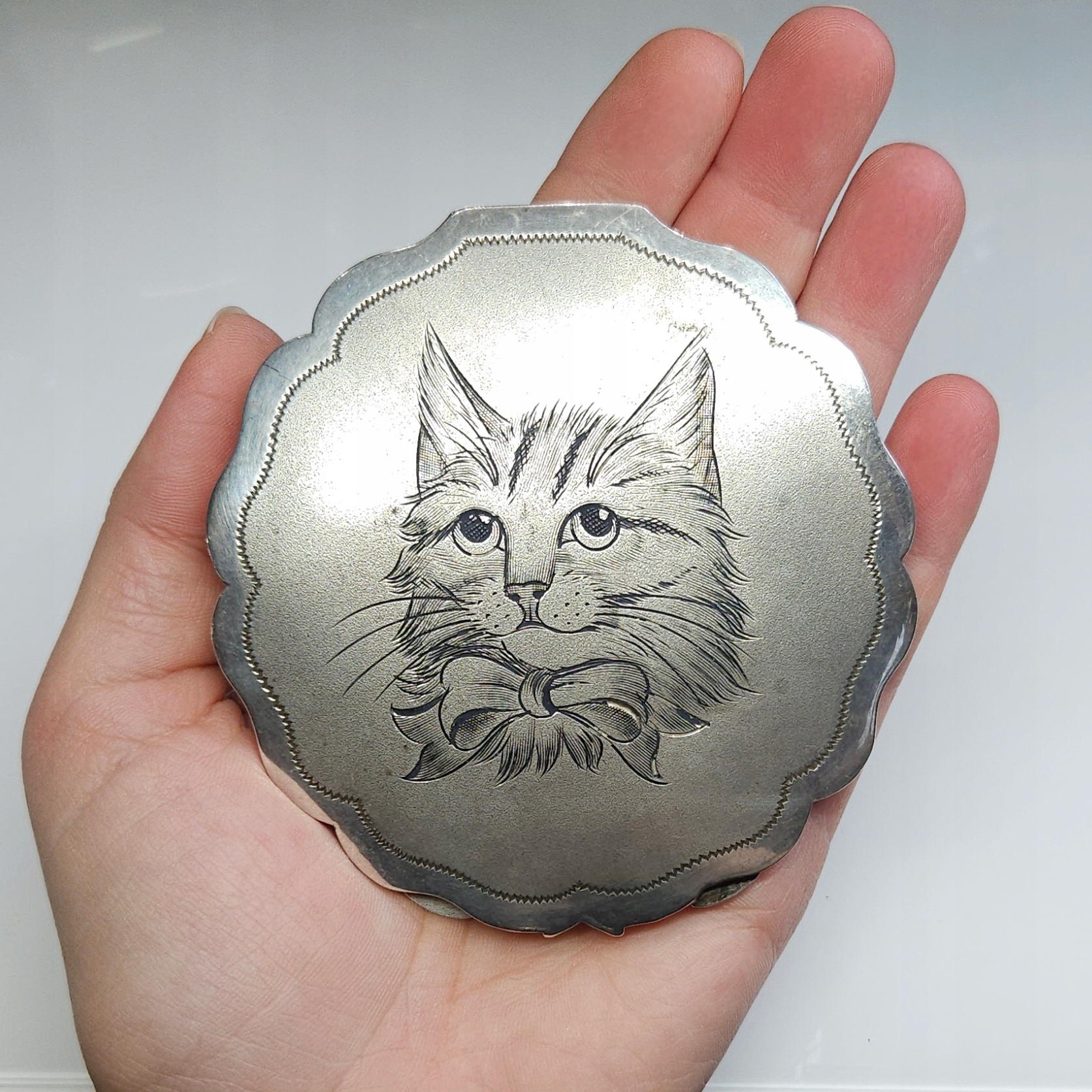 Предмет продажи — серебряная пудреница-зеркало с выгравированным вручную мотивом кота на крышке
