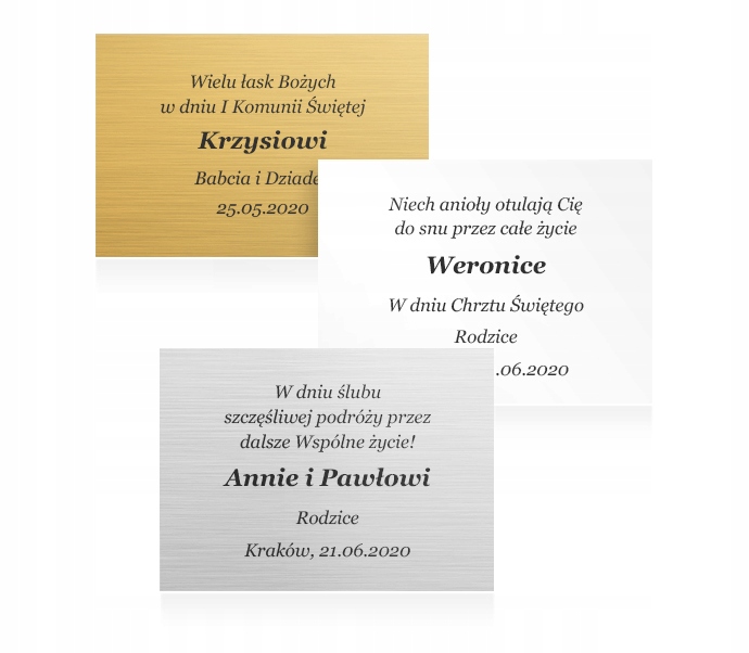 Посвященная табличка размещается на обратной стороне серебряной картины и выполнена в технике гравюры, что означает, что выбранный вами текст будет напечатан на тонкой алюминиевой пластине. Техника гравировки гарантирует привлекательный внешний вид тарелки и ее долговечность. И самое главное, он не мешает поверхности серебряной картины, поэтому не становится персонализированным товаром - поэтому вы можете вернуть его в течение 14 дней без объяснения причин.