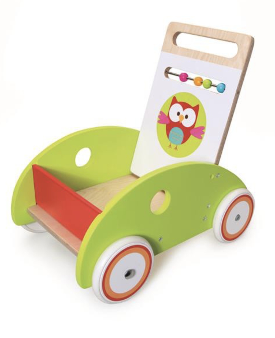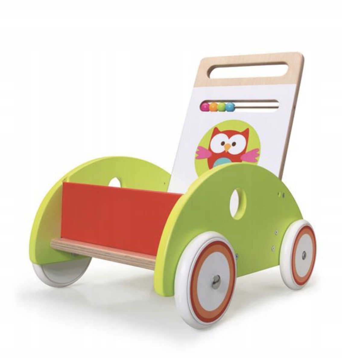 Деревянная толкалка с мотивом совы Лу для самых маленьких детей, делающих первые шаги. Коляска изготовлена из высококачественного бука. У нее резиновые колеса, которые не оставляют следов на полу.