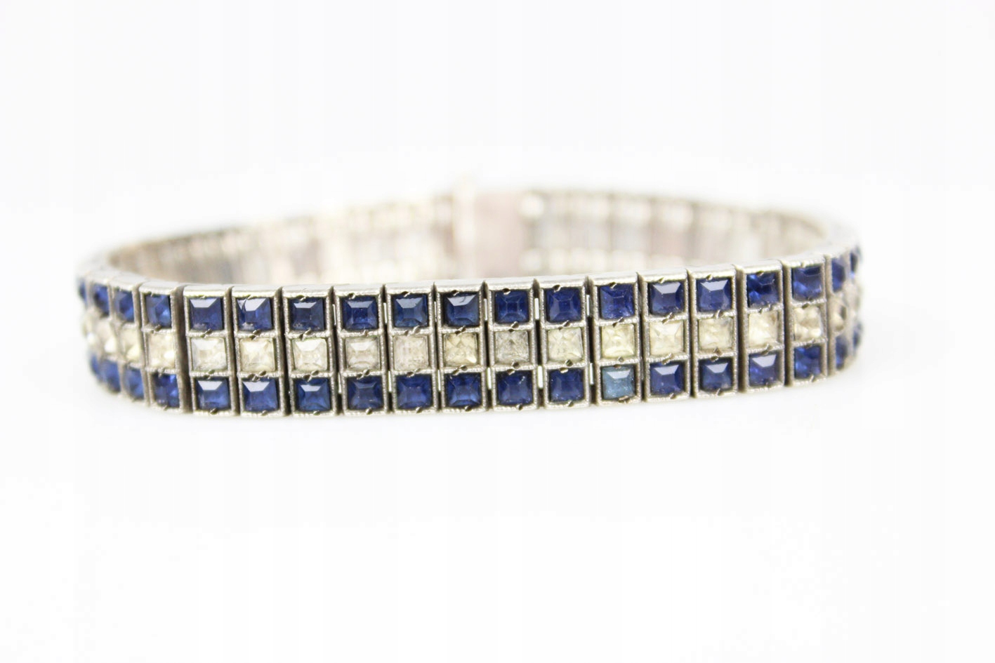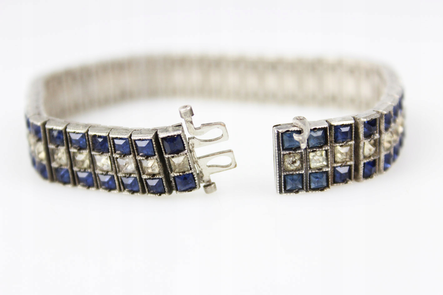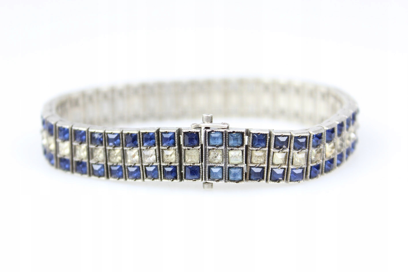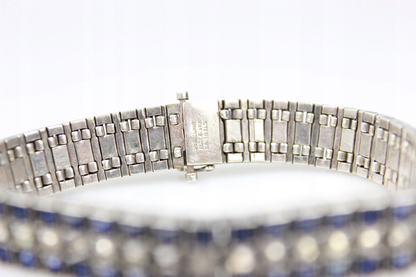 Оригинальный американский браслет 1930-х годов. Сегментированная конструкция из серебра, украшенная граненым цветным стеклом, имитирующим сапфиры и бриллианты. Браслет с маркировкой STERLING. Патентованная застежка с дополнительной защитой. Размеры: