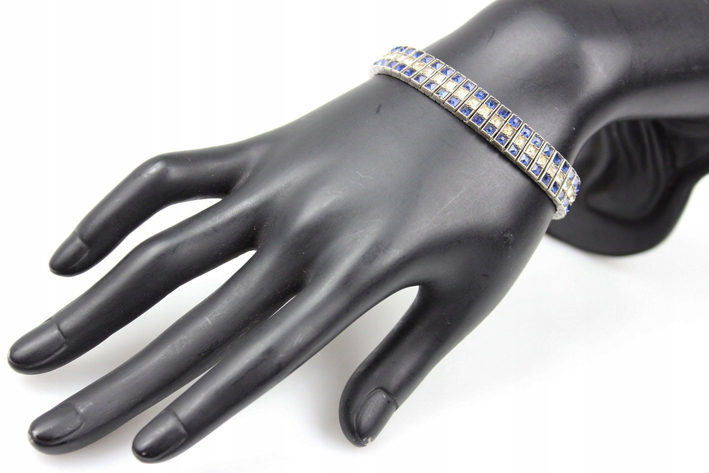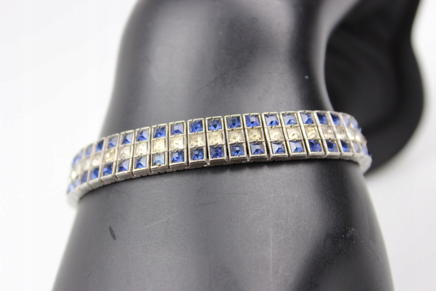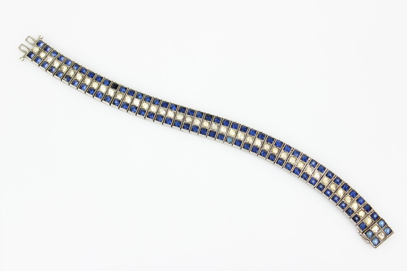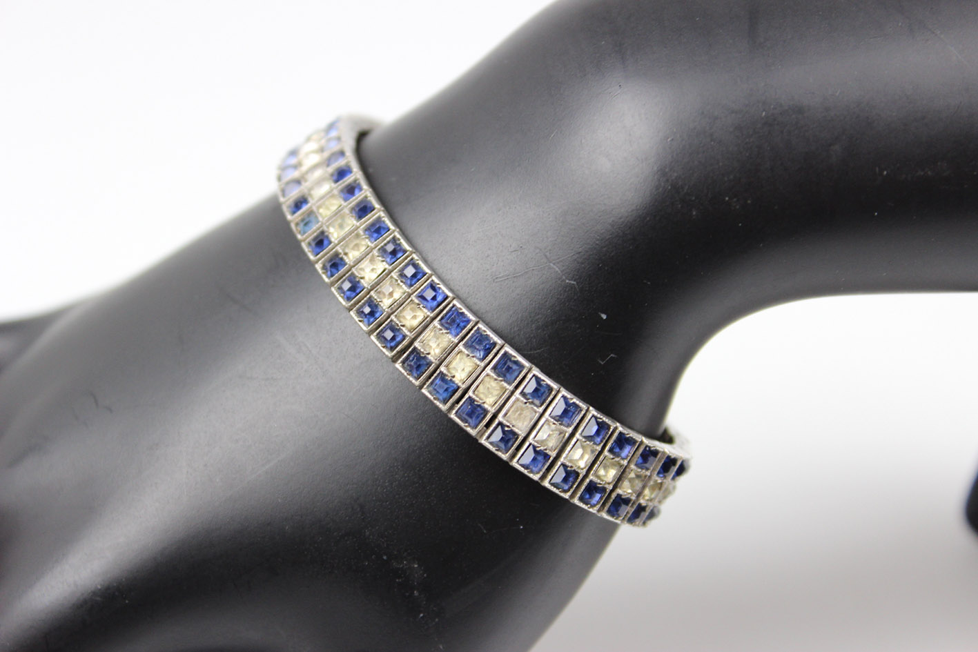 Оригинальный американский браслет 1930-х годов. Сегментированная конструкция из серебра, украшенная граненым цветным стеклом, имитирующим сапфиры и бриллианты. Браслет с маркировкой STERLING. Патентованная застежка с дополнительной защитой. Размеры: