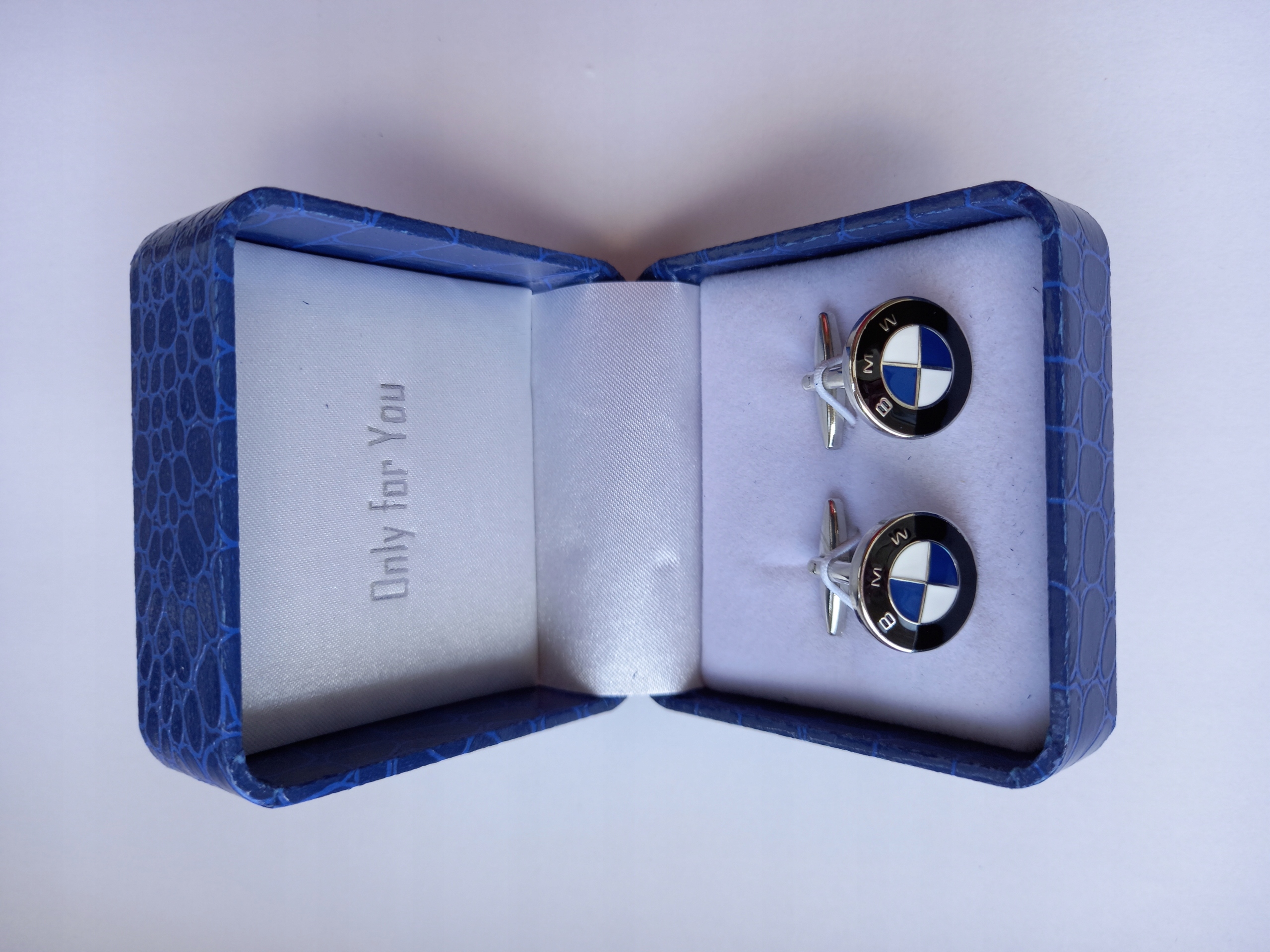 Красивый набор из двух запонок для рубашки, в виде эмблемы бренда BMW, упакованных в красивую картонную подарочную коробку синего или черного цвета или других цветов по запросу.