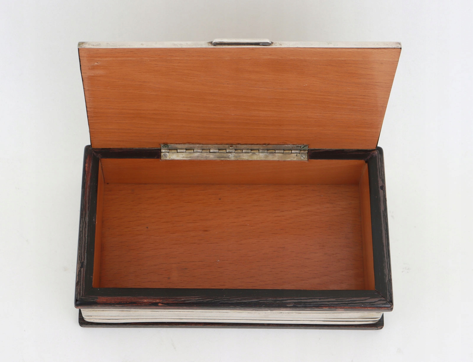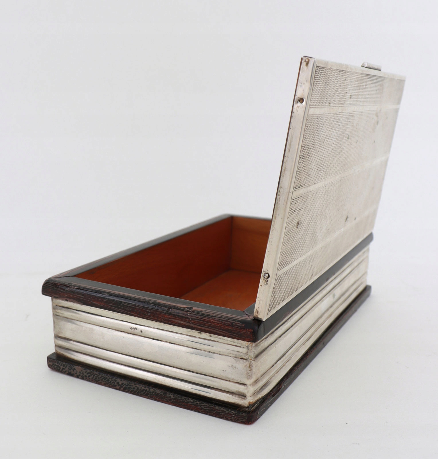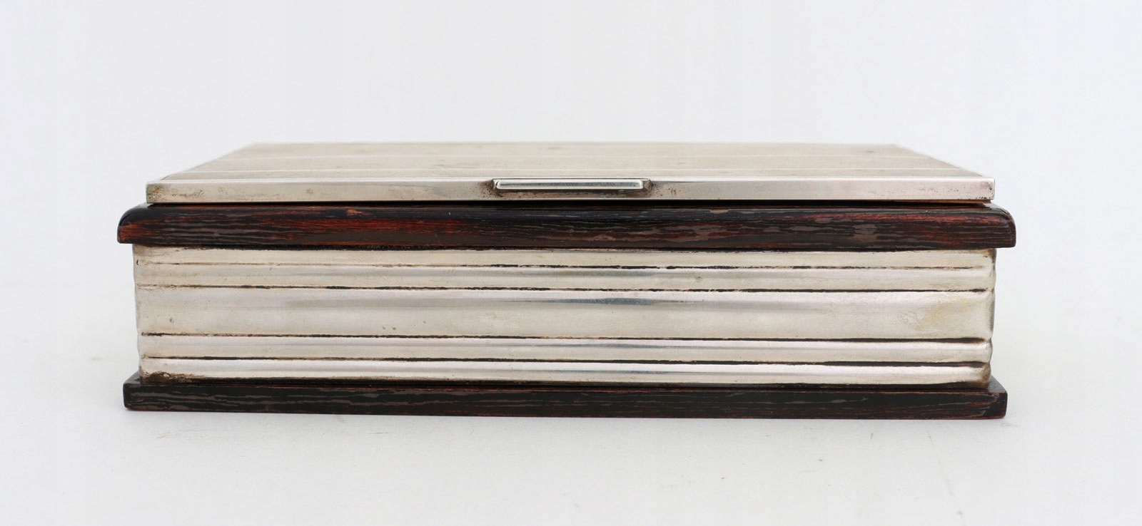 Хьюмидор для сигар, верх и бока из серебра 800 пробы. Серебряные элементы - верх гильошированный, бока загнутые. Центр облицован экзотическим деревом.