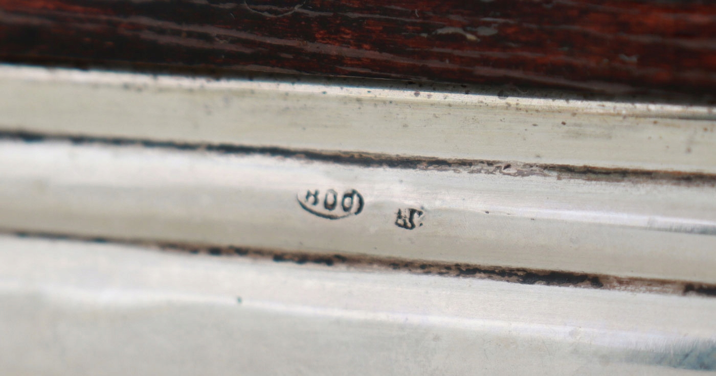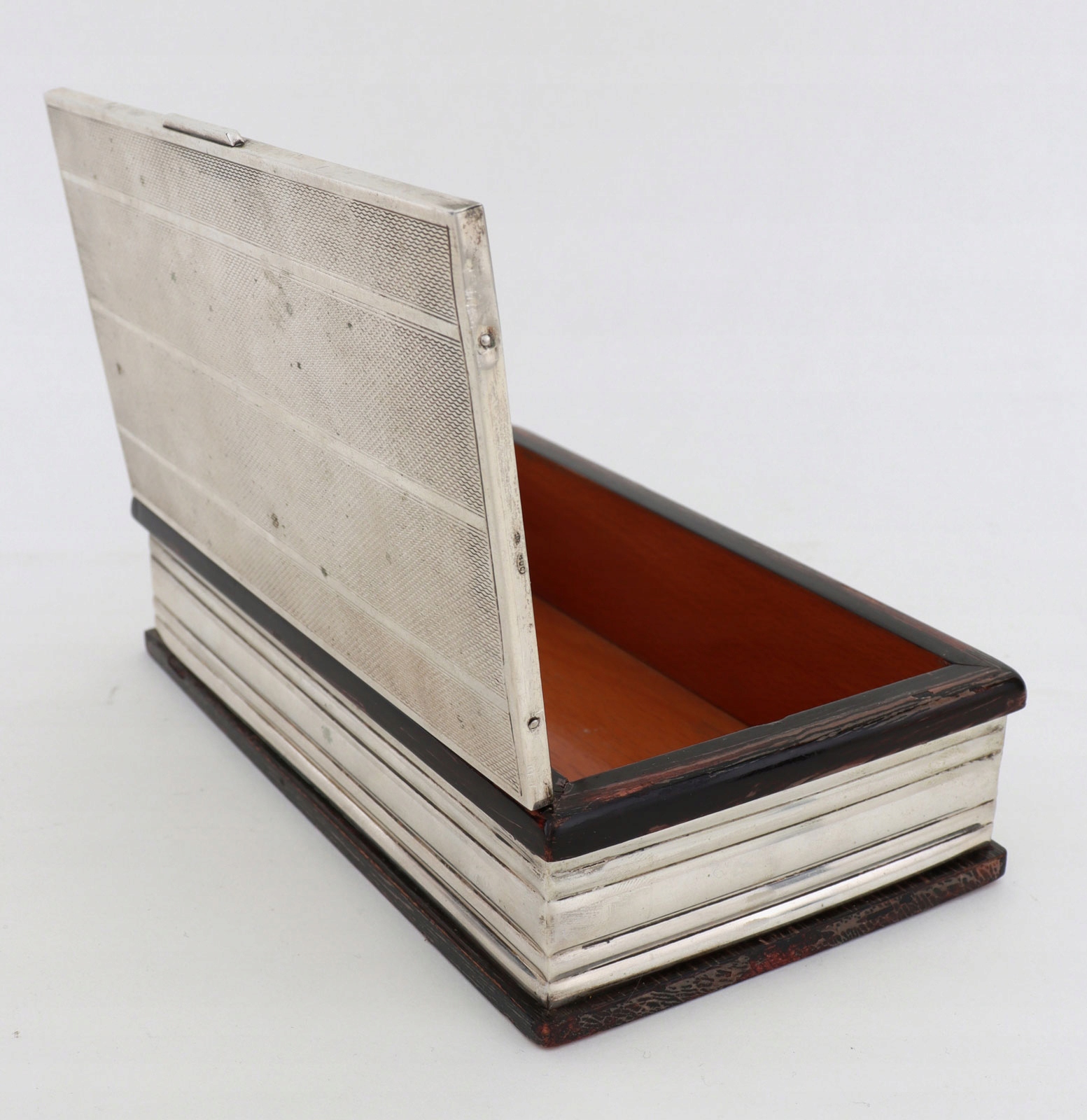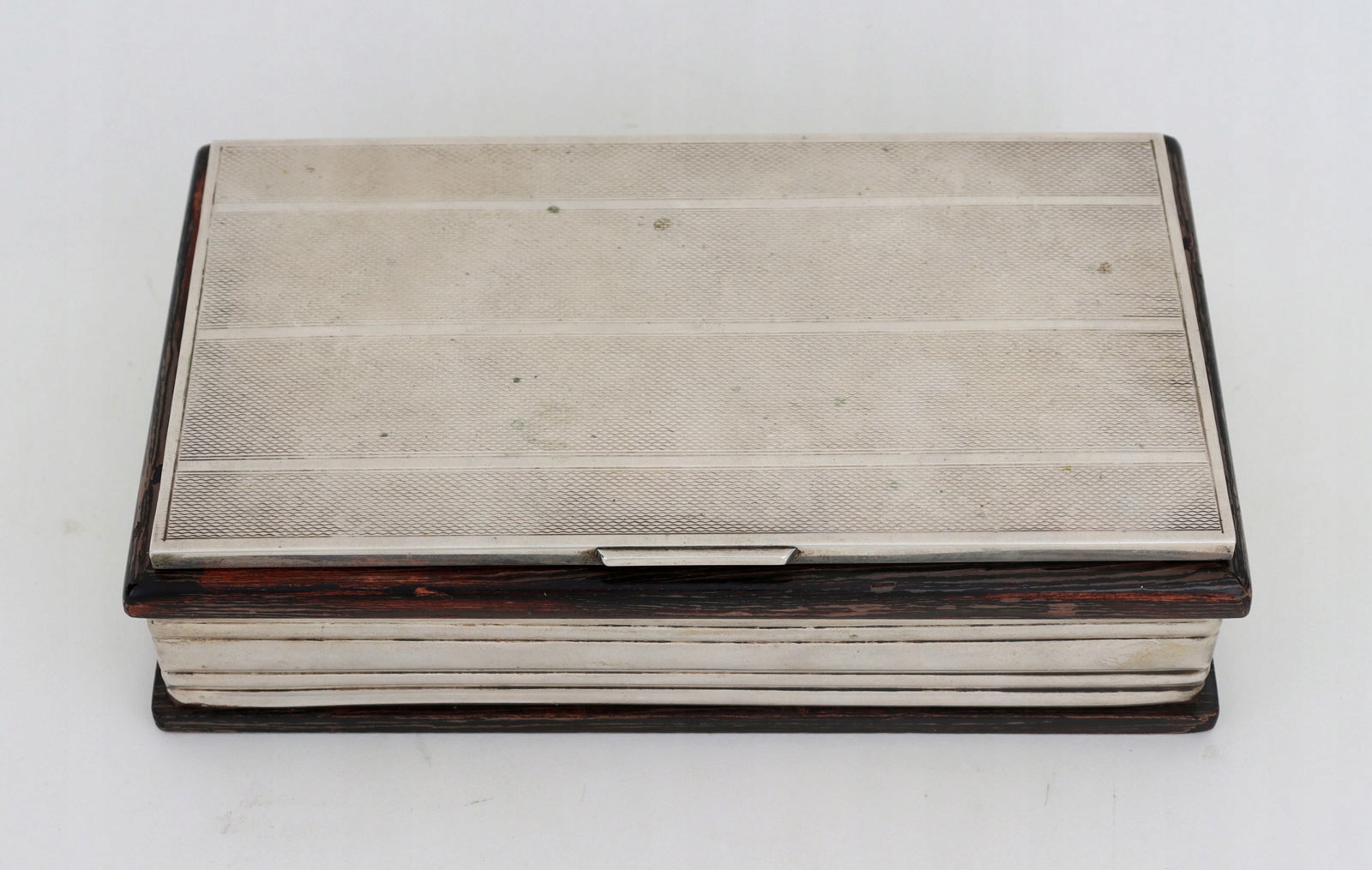 Хьюмидор для сигар, верх и бока из серебра 800 пробы. Серебряные элементы - верх гильошированный, бока загнутые. Центр облицован экзотическим деревом.