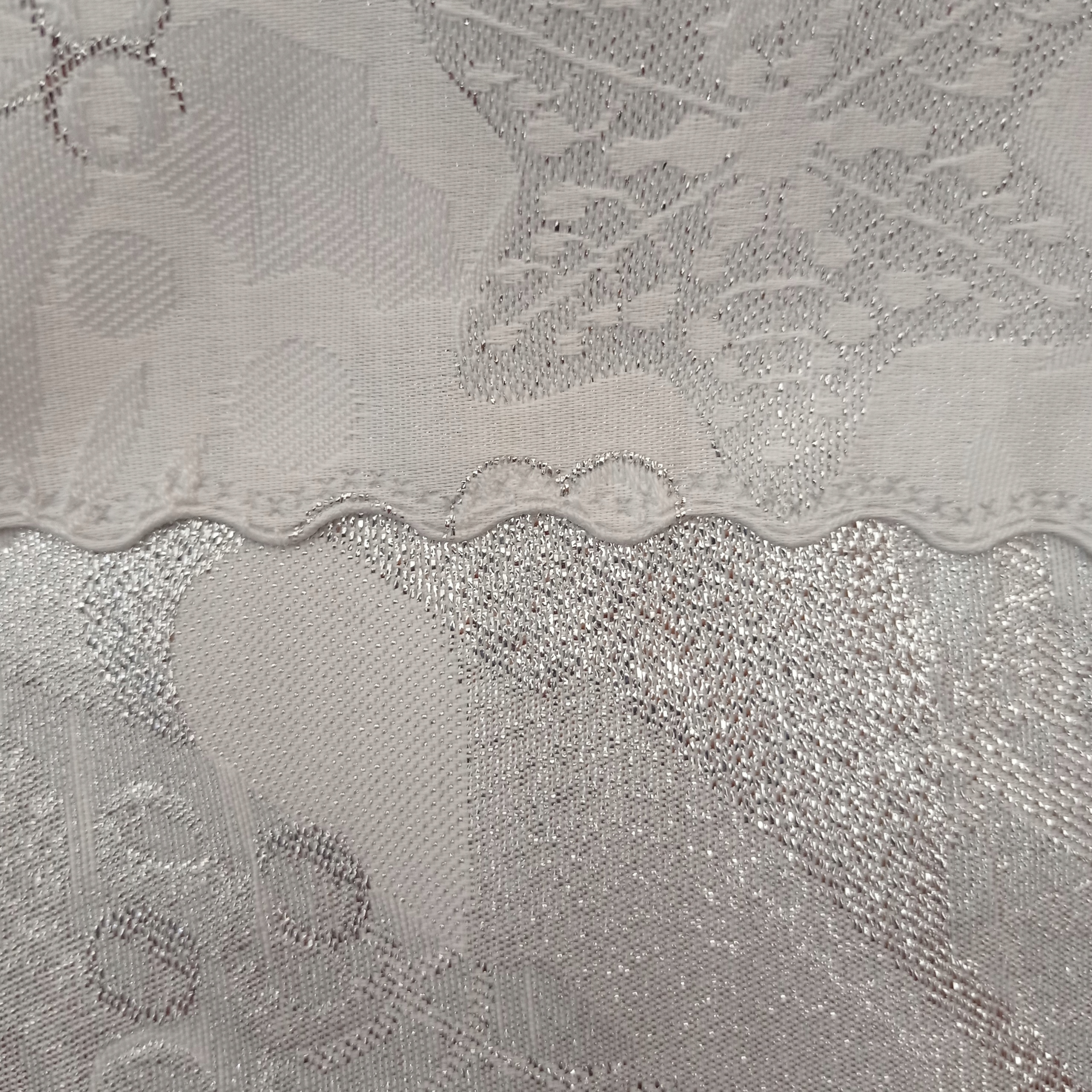Один из самых красивых рождественских ступеней на аллегро, серебристо-белом, блестящей скатерти с чрезвычайно элегантным сочетанием мотивов, вызывая то, что скатерть не «перегружена». Вифлеемная звезда в со вкусом разбитого белого и светящегося серебра определенно произведет большое впечатление на домохозяйство. золото).