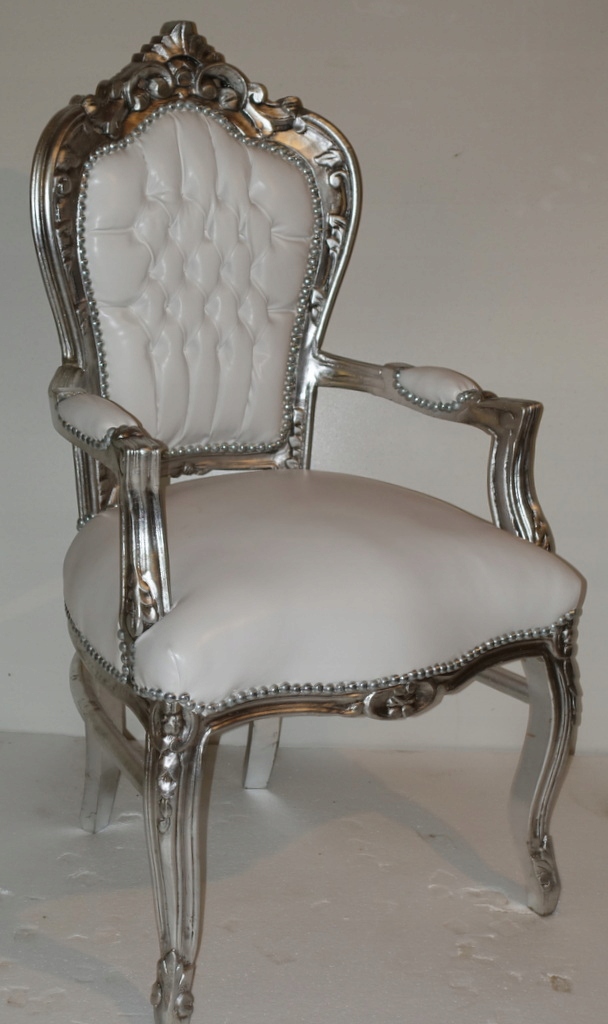 Стильный стул в стиле барокко с подлокотниками. Новая, не бывшая в употреблении мебель, выполненная в современном стиле под старину под старину. Дерево цвета старого серебра, обивка из белой экологической кожи; со вкусом простегана на спинке.