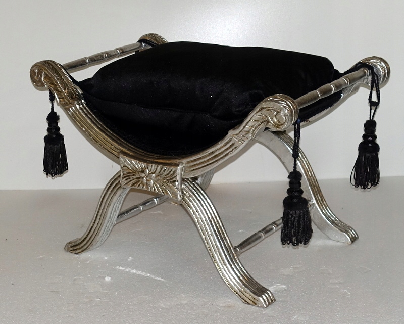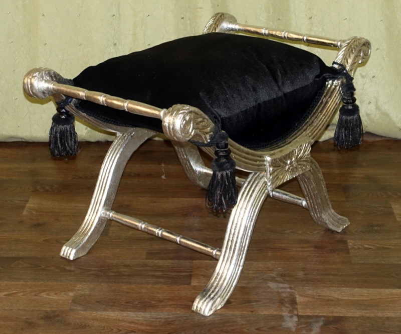 Стильный зиделек - сиденье, выполненное в современном стиле. Деревянная мебельная конструкция, тонко вырезанная по всей поверхности серебром. Подушка изготовлена из черного плюша, отделана декоративной бахромой по углам. Его можно использовать в качестве сиденья в прихожей при переобувании, в ванной при пользовании туалетом или как дополнительное место в гостиной, когда приходит больше гостей.
