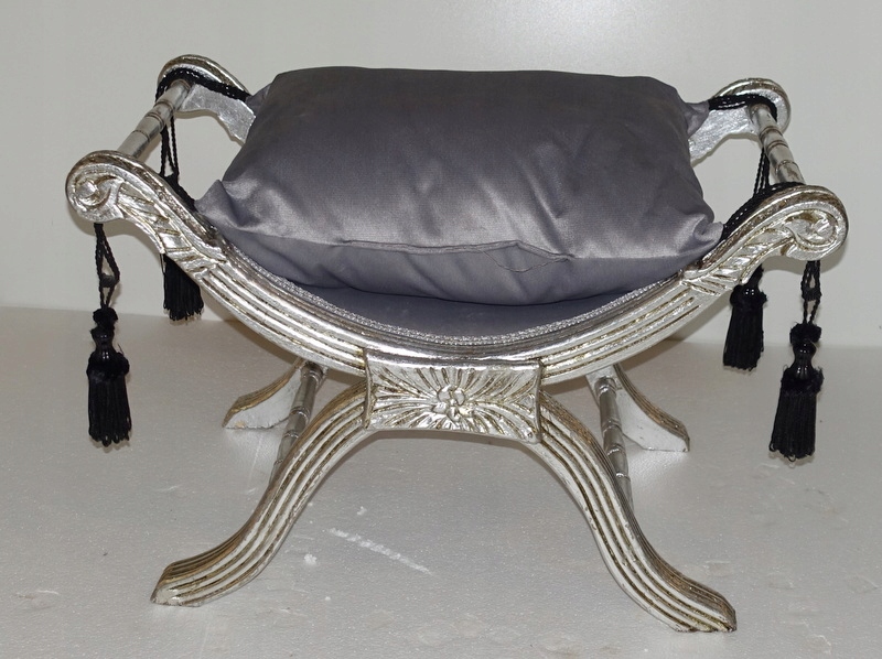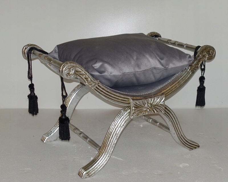 Стильный зиделек - сиденье, выполненное в современном стиле. Деревянная мебельная конструкция, тонко вырезанная по всей поверхности серебром. Подушка изготовлена из черного плюша, отделана декоративной бахромой по углам. Его можно использовать в качестве сиденья в прихожей при переобувании, в ванной при пользовании туалетом или как дополнительное место в гостиной, когда приходит больше гостей.