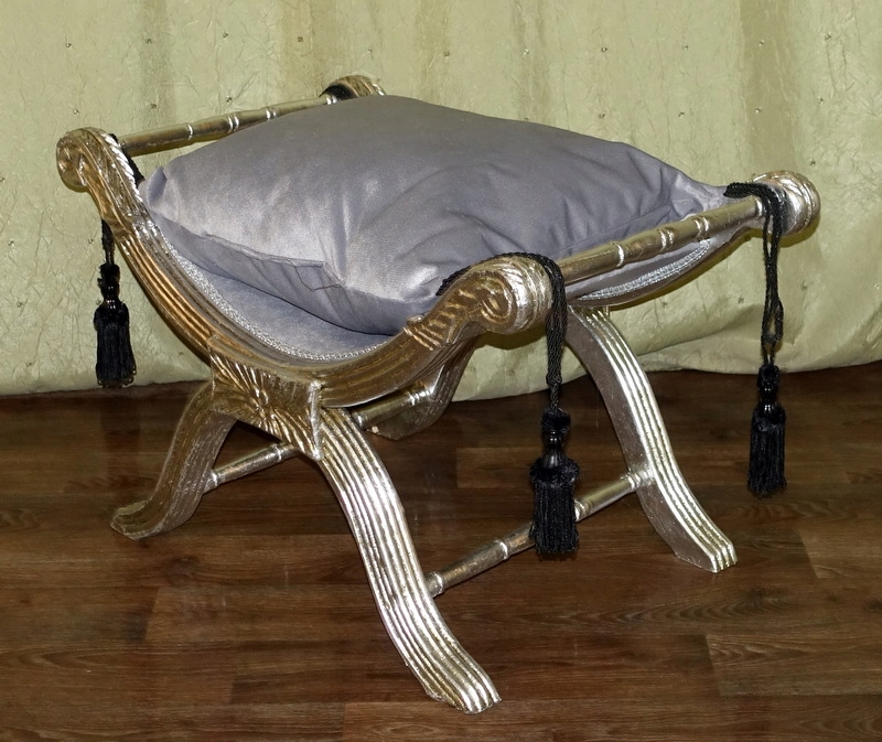 Стильный зиделек - сиденье, выполненное в современном стиле. Деревянная мебельная конструкция, тонко вырезанная по всей поверхности серебром. Подушка изготовлена из плюша серого оттенка, отделана декоративной бахромой по углам. Его можно использовать в качестве сиденья в прихожей при переобувании, в ванной при пользовании туалетом или как дополнительное место в гостиной, когда приходит больше гостей.