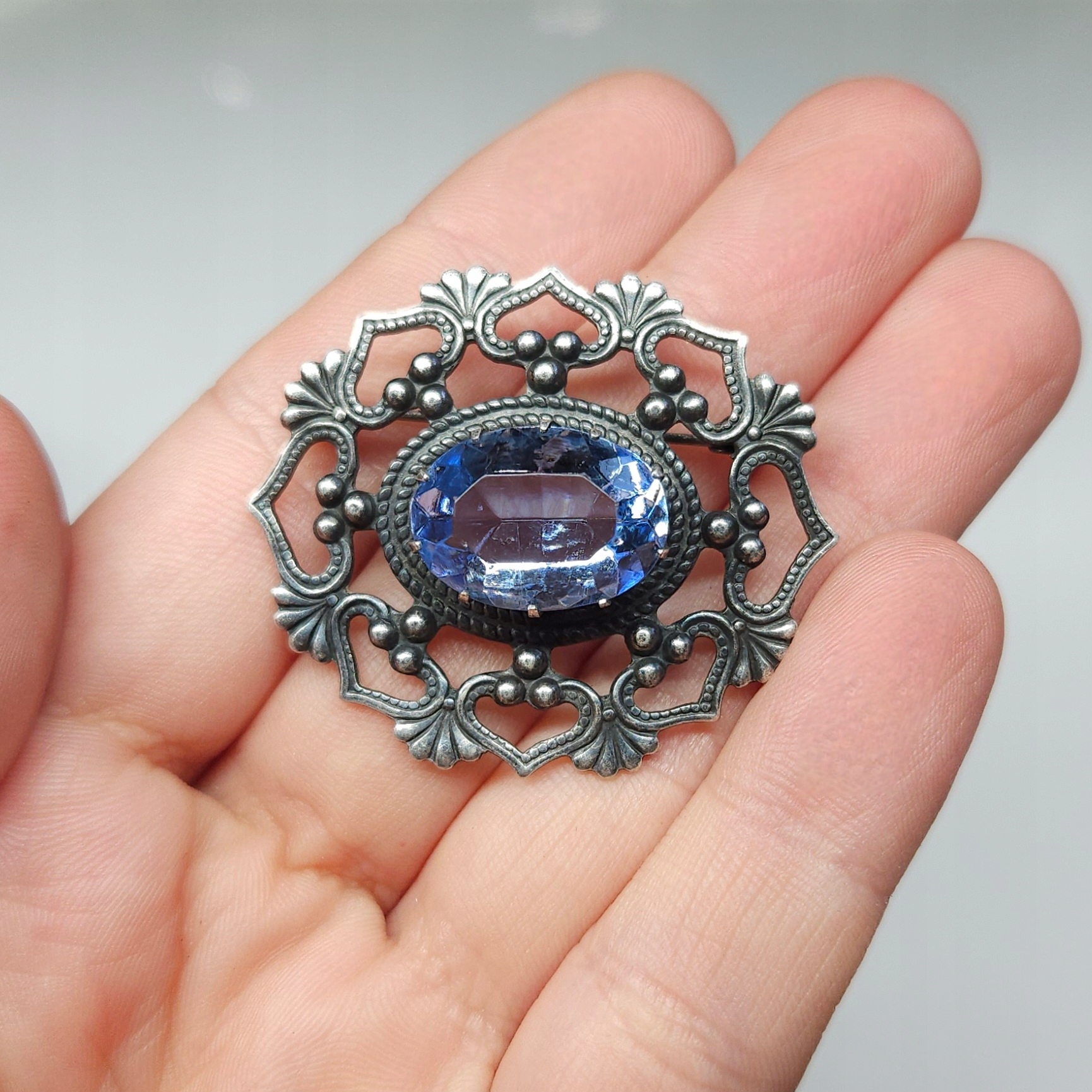 Предмет продажи — серебряная ажурная брошь с голубым камнем из витражного стекла.