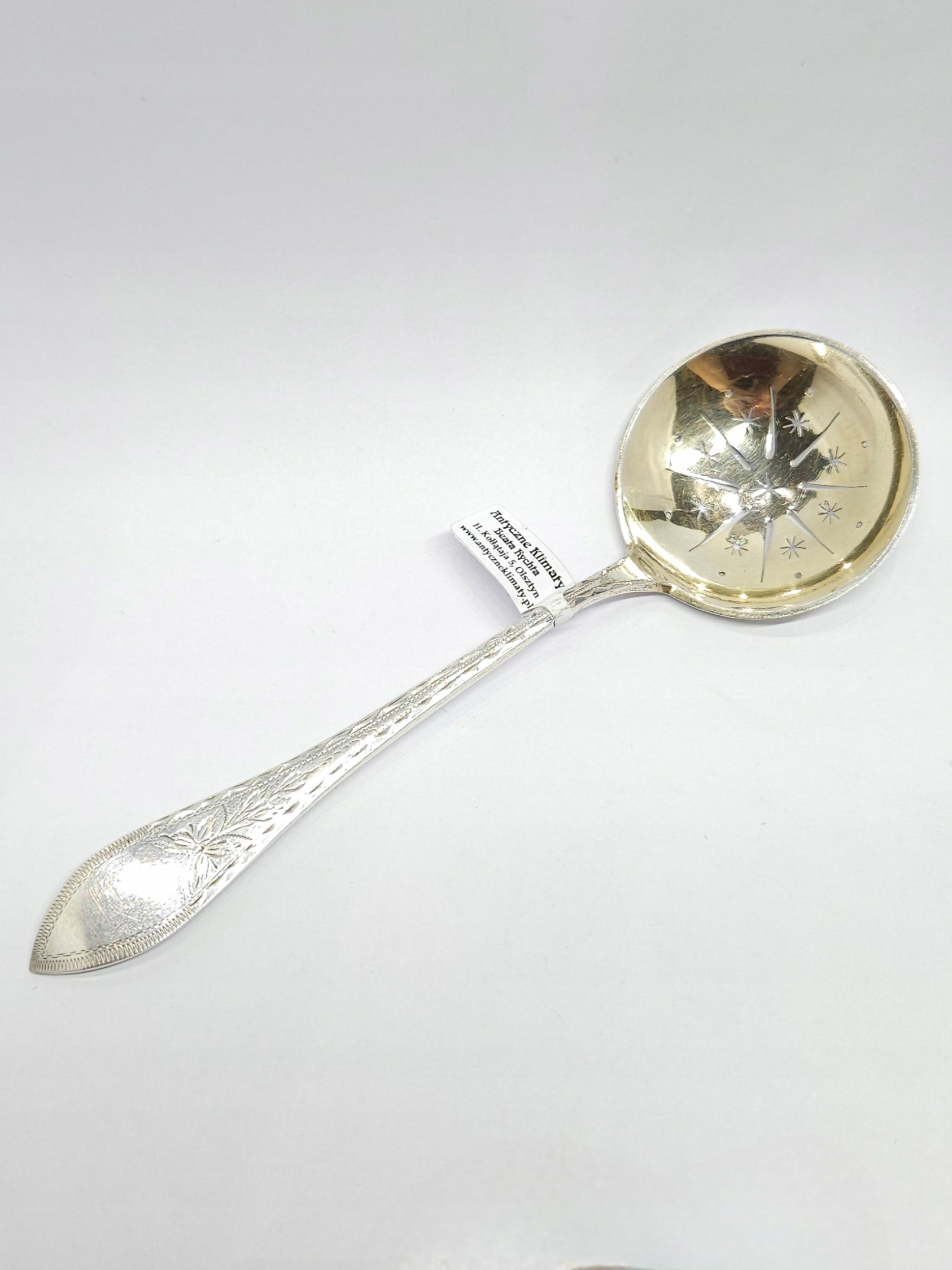 Срібна ажурна позолочена ложка місцево, ситечко срібло 0,800 дл. 18,2см