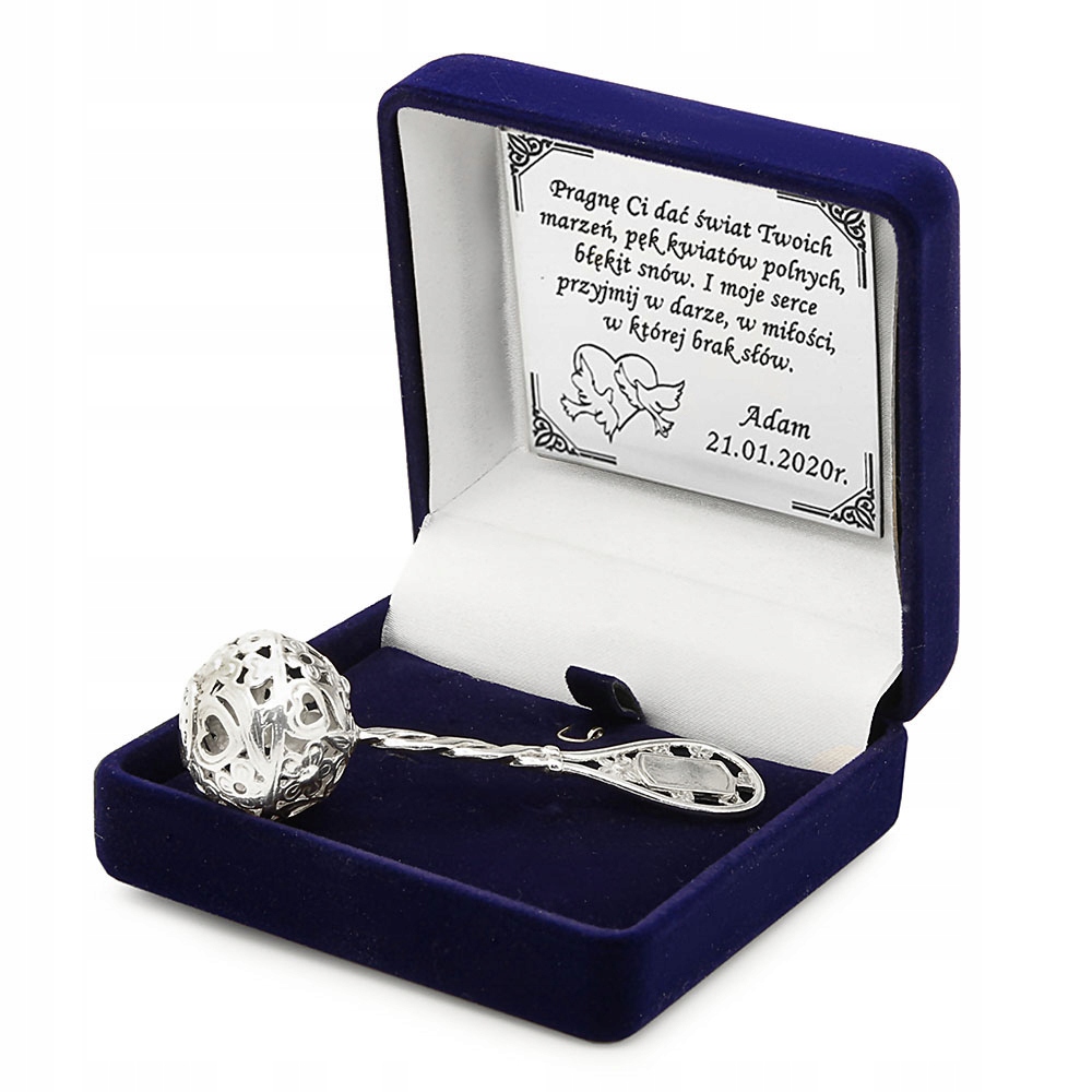 Погремушка – прекрасный подарок на крещение или на память о рождении как мальчику, так и девочке. Изготовленный полностью из серебра 925 пробы, он станет уникальным подарком, а индивидуальная гравировка придаст ему неповторимый характер. Гравировка на погремушке, корпусе и любой надписи на шкатулке бесплатно.