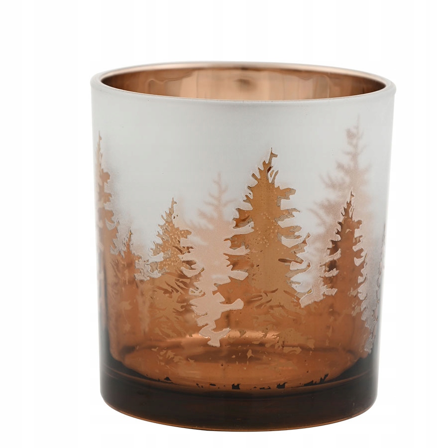 Стеклянная подсвечника в коричневом/серебре изнутри, облицованной отражающим слоем золота, украшенного мотивом рождественских елок. Эта простая декоративная обработка с свечей, освещенной внутри, осветляет и раскрывает рисунок на внешней поверхности свечи через свет. Он будет работать приятным украшением для глаз, которое аккуратно осветит и подчеркнет расположение стола за праздник или создаст приятное настроение во время спонтанной встречи с глинтвейным вином зимним вечером.