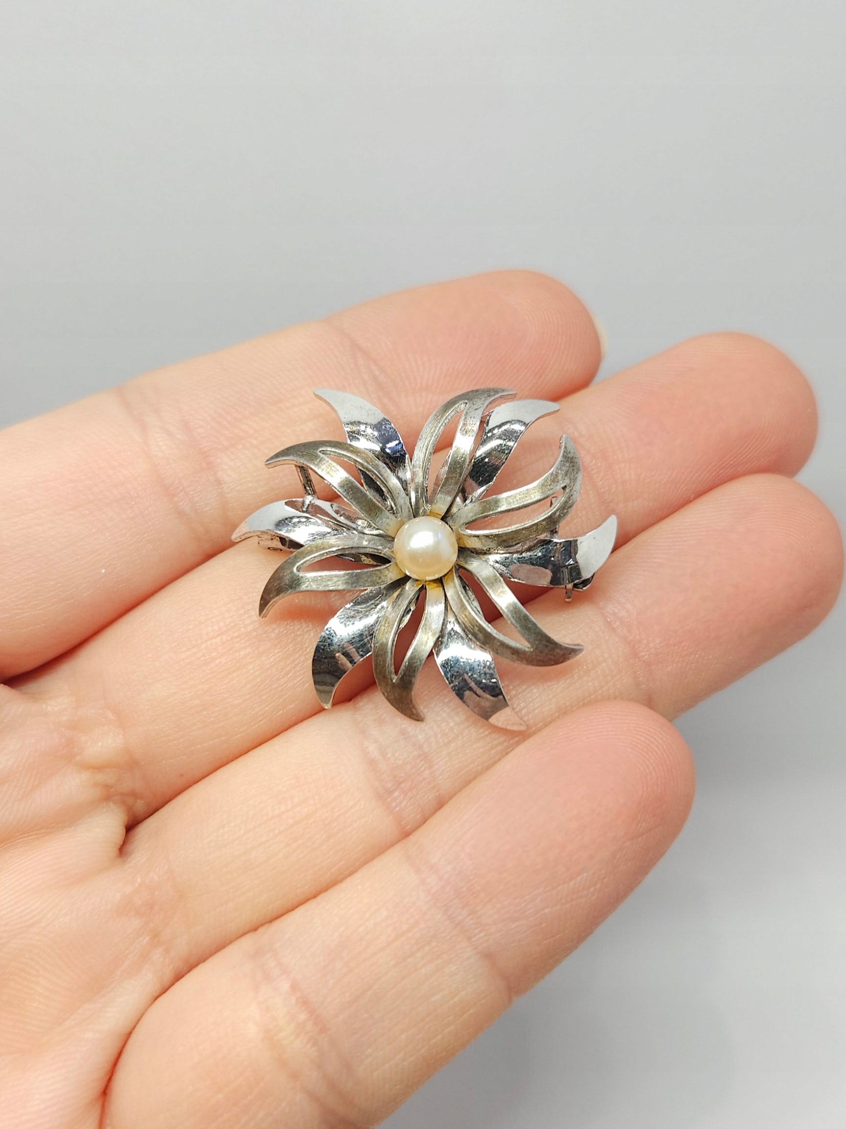 Серебряная брошь с искусственным жемчугом, цветок из серебра 0.925 пробы