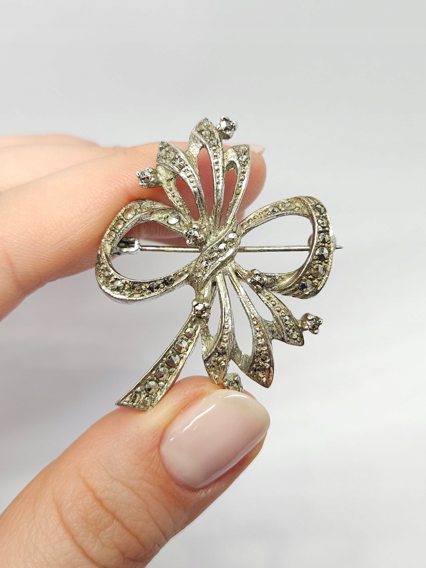 Серебряная брошь с марказитами, бантик из серебра 0.835.