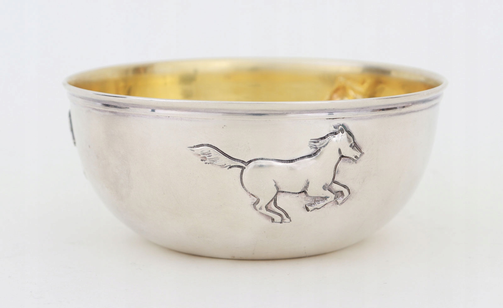 Сахарница из серебра 925 пробы. Пальто украшено завитыми вручную скачущими лошадьми. Внутренняя поверхность сахарницы огненно позолочена.