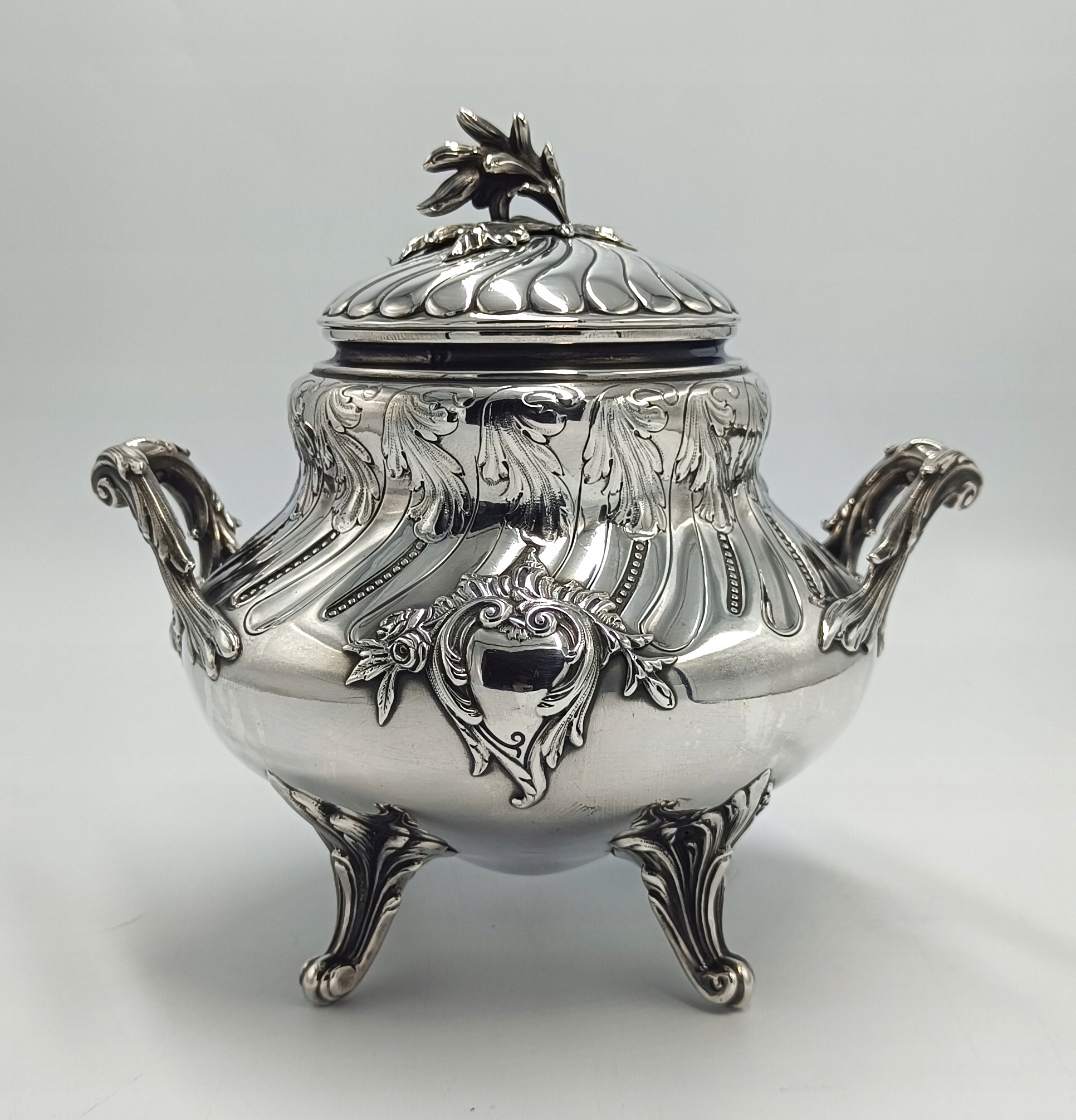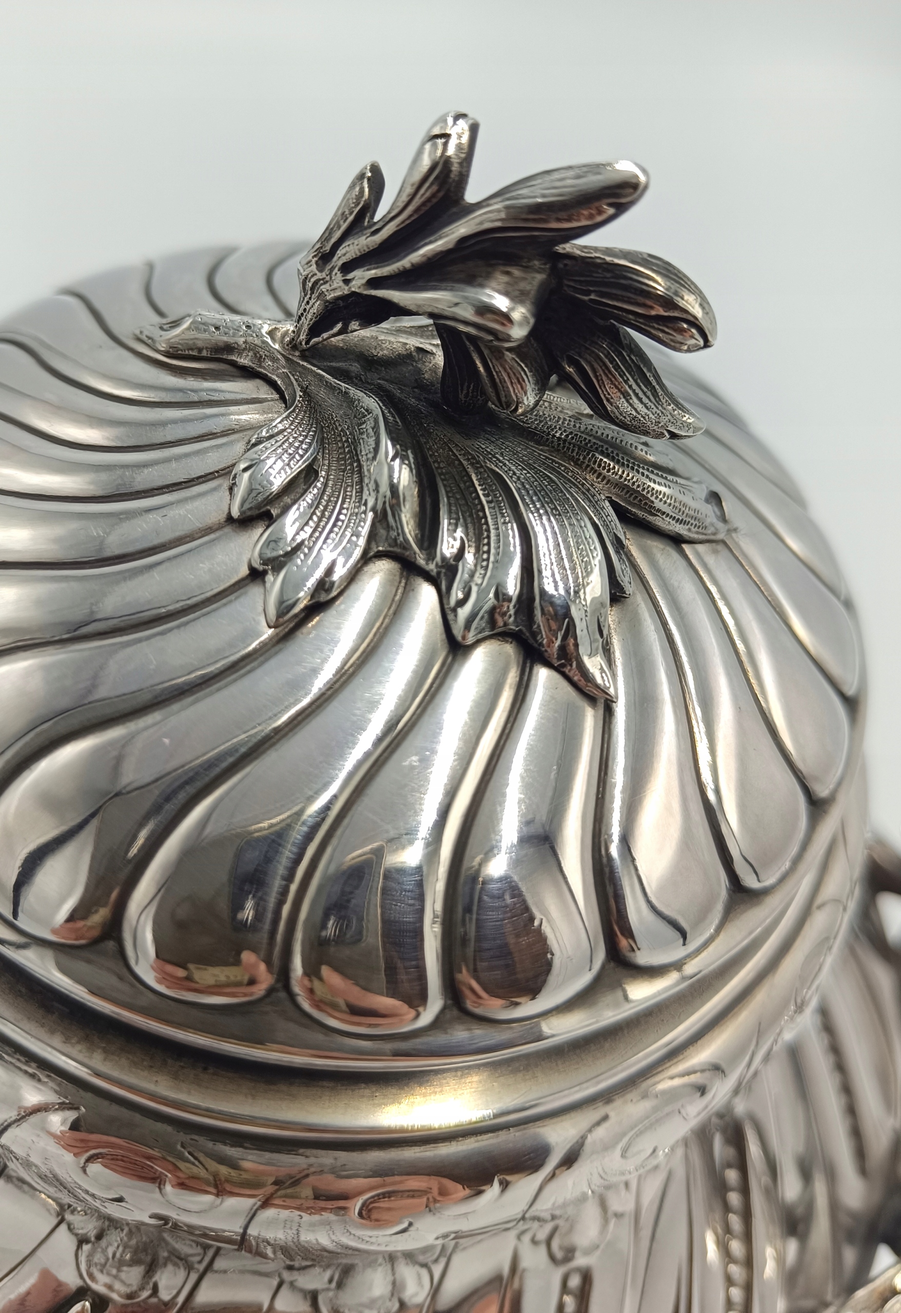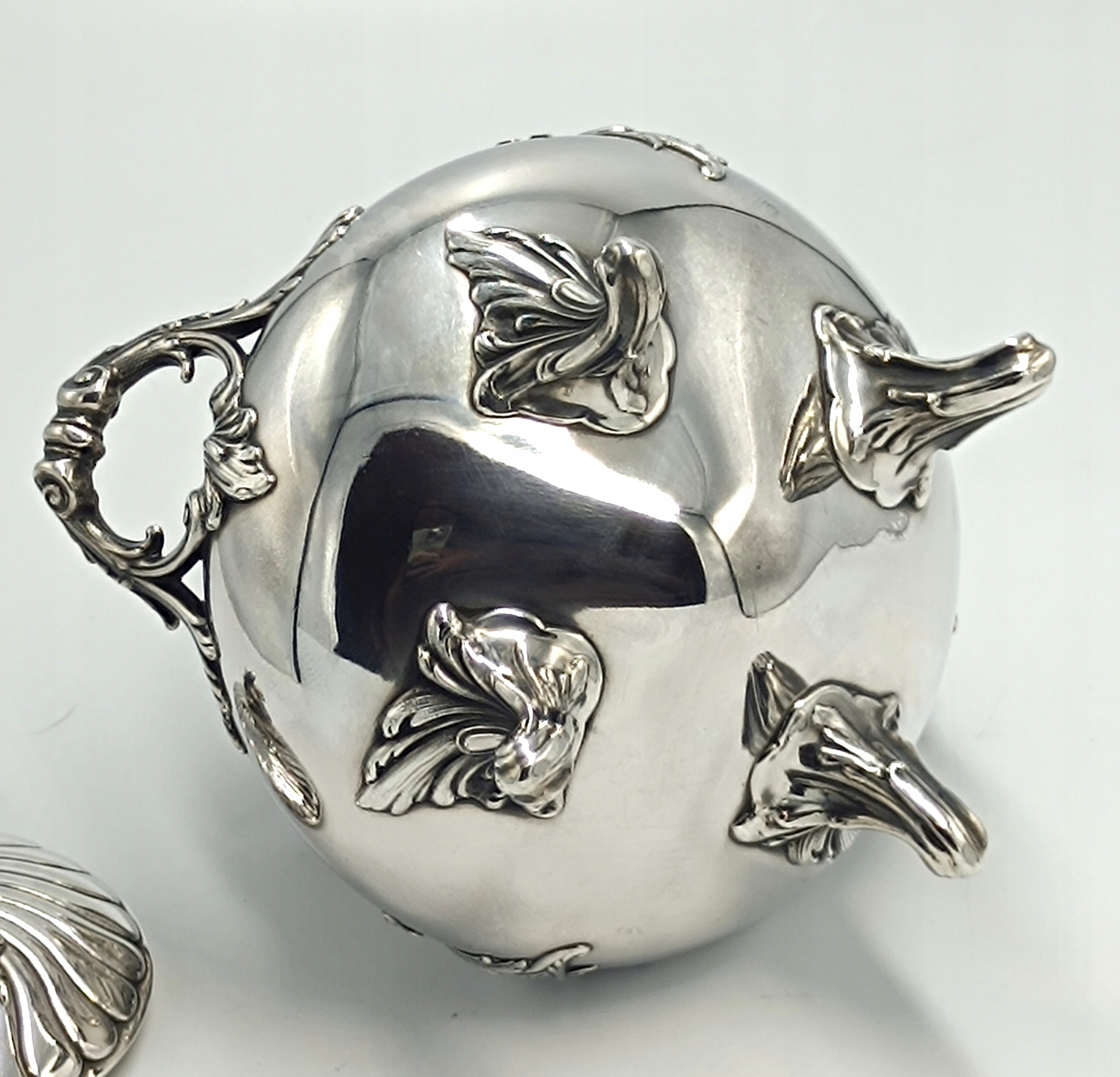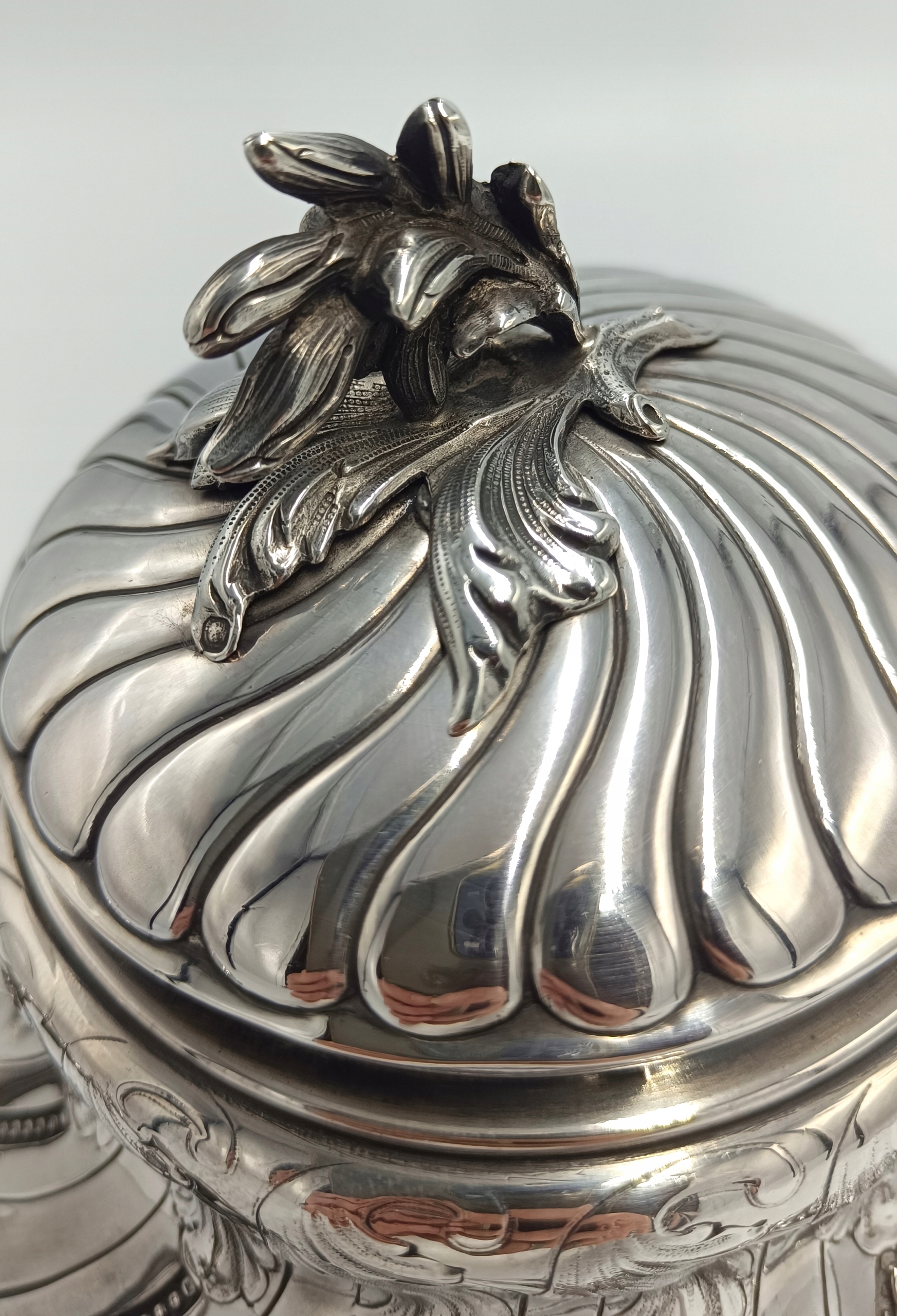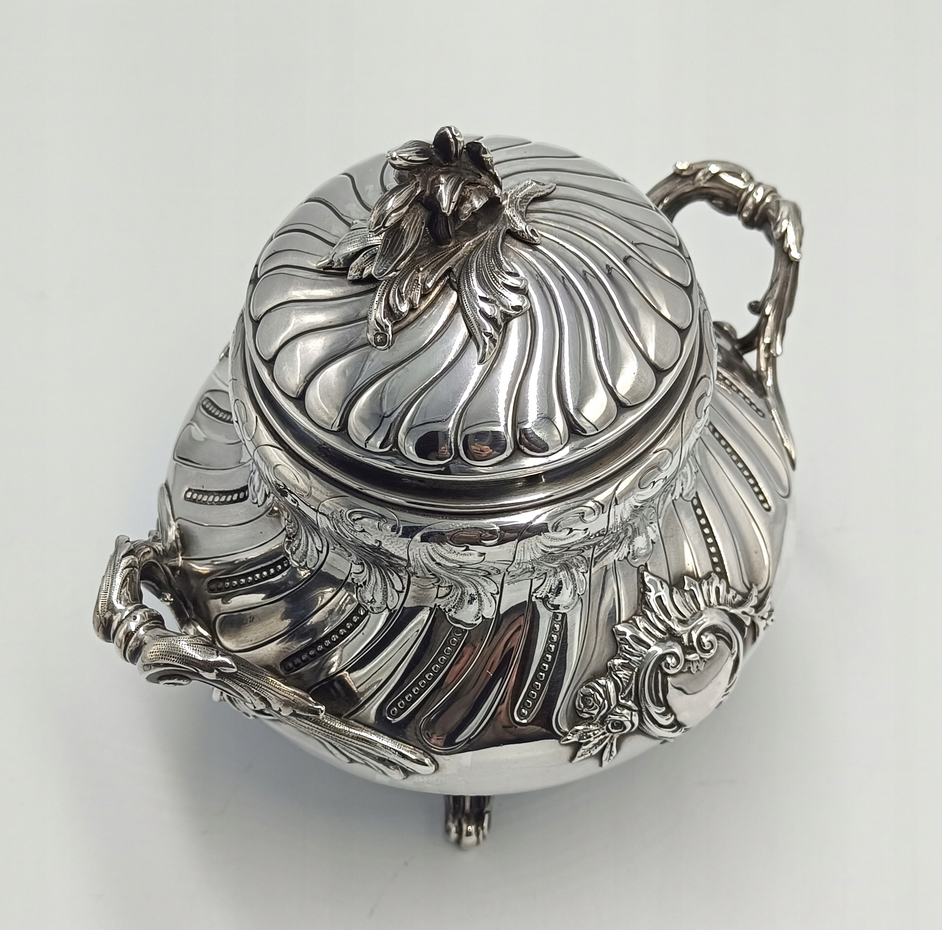 мы представляем чрезвычайно сложную сахарную чашу, полностью изготовленную из 950 серебра, о чем свидетельствует Пунка на ее крышке с головой минерала и номером 1 справа. - Этот знак использовался с 1838 года. Кондитерский состав был сделан во Франции во время отделения (1890R-1910). Характерными чертами стиля искусства являются жидкость, волнистые линии, абстрактные, растения или украшение животных, а также асимметрия и богатые, элегантные украшения. Четыре ноги, которые выглядят очень элегантно. Держатель крышки и ручки по бокам кондитерского изделия являются ювелирным элементом. Выпуклый живот и суженная верхняя часть придает ему удивительное очарование p> Размеры:
