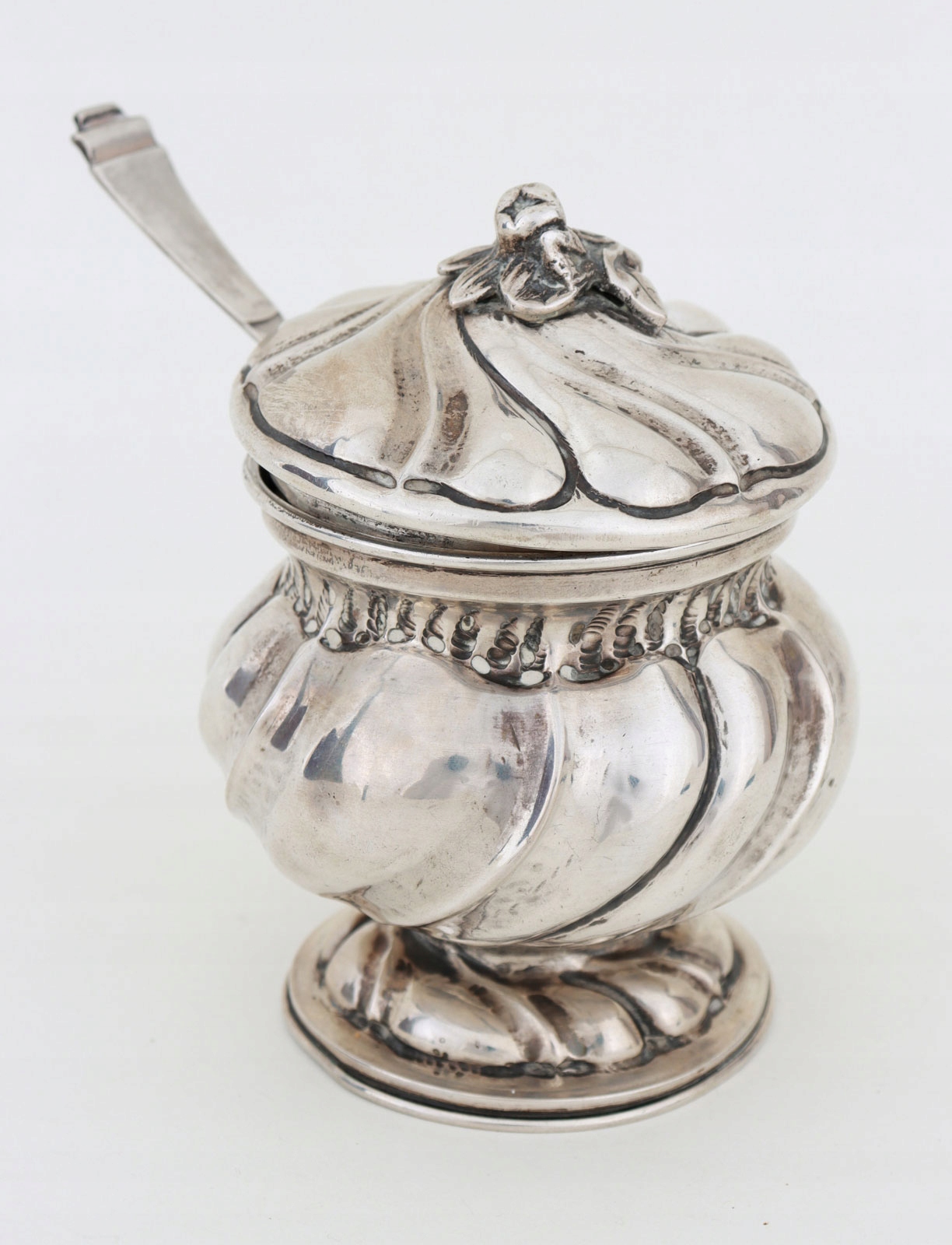 Сахарницаиз серебра 800 пробы Сахарница на круглой ножке, украшенной каннелюрами, вершиной в виде пластикового цветка. Ложка из серебра 800 пробы, ковш в форме ракушки.