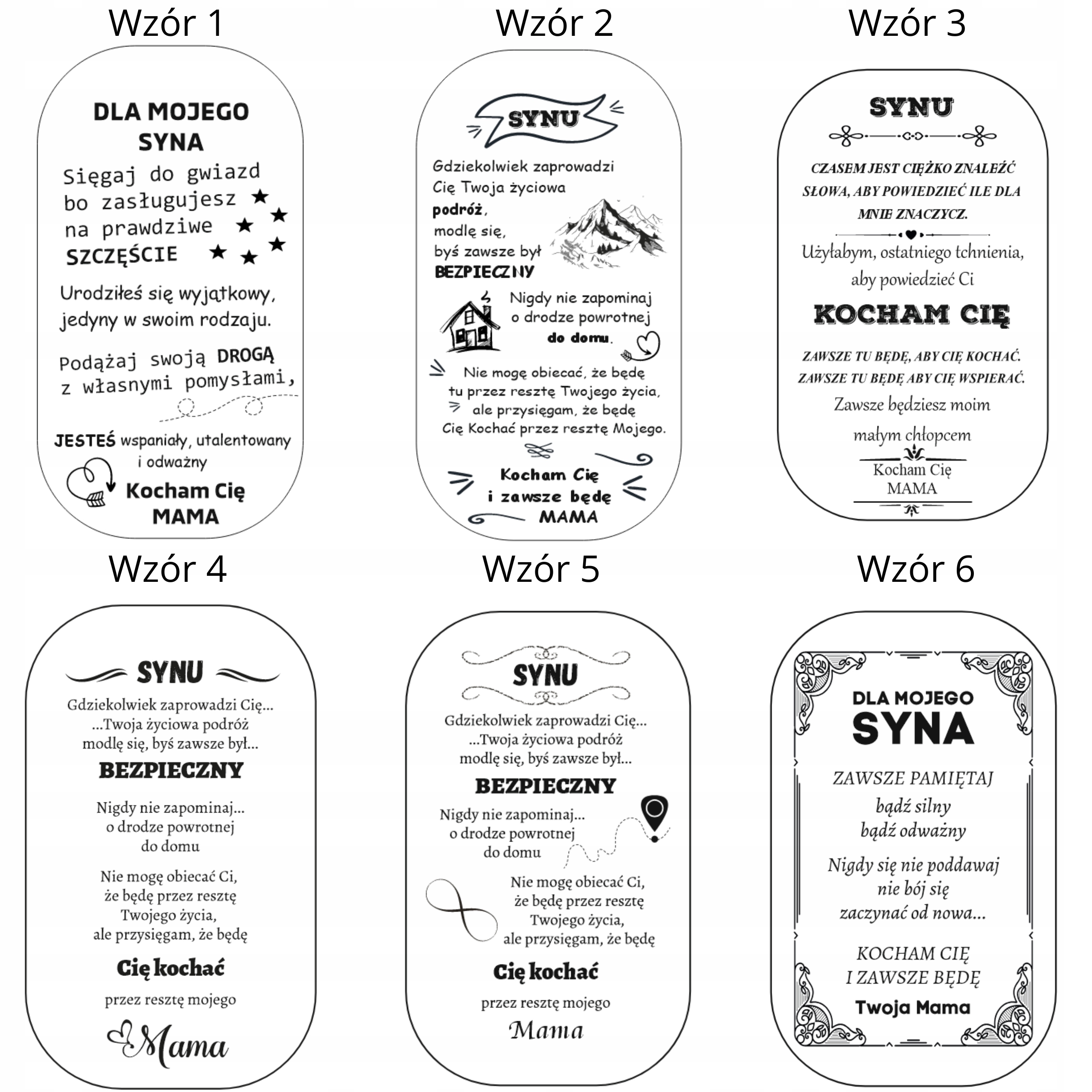 Есть 6 дизайнов на выбор. Вы также можете организовать контент самостоятельно, который вы хотите передать своему сыну. Мы сделаем индивидуальную гравировку для вас! в сообщении продавцу дайте номер шаблона или персонализированное сообщение, которое должно быть на подвеске.