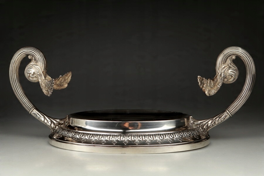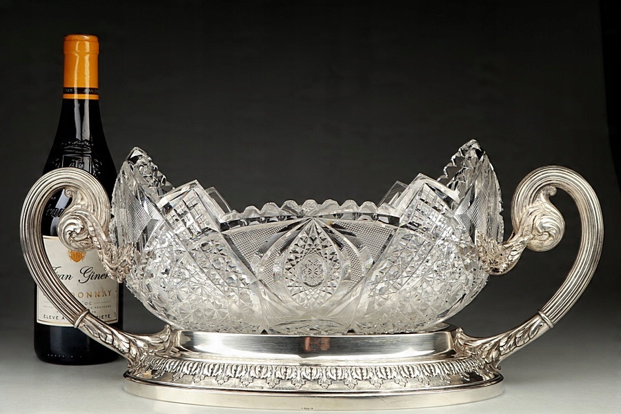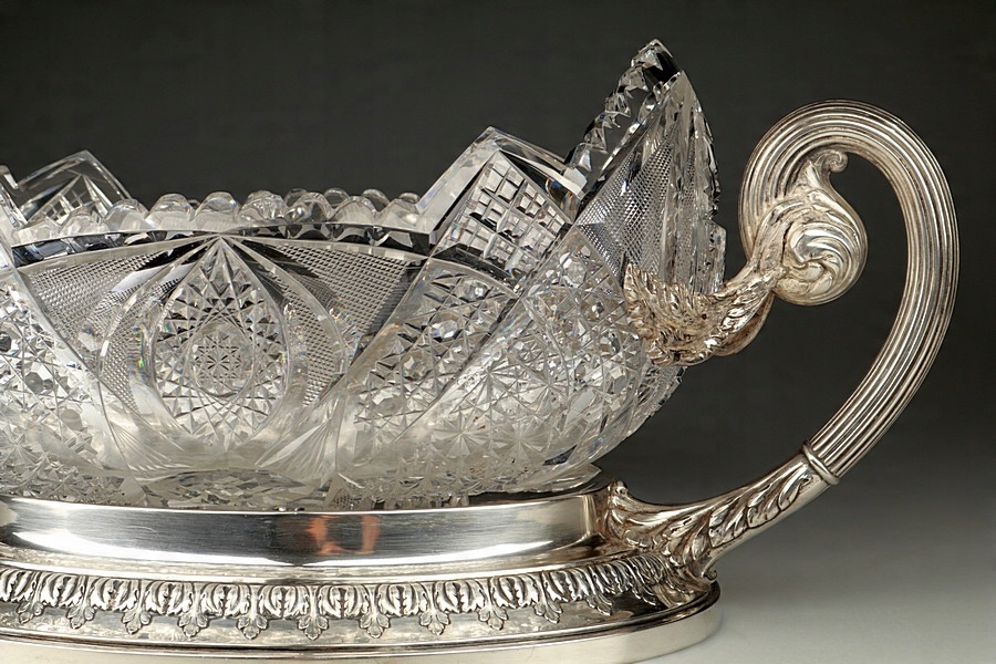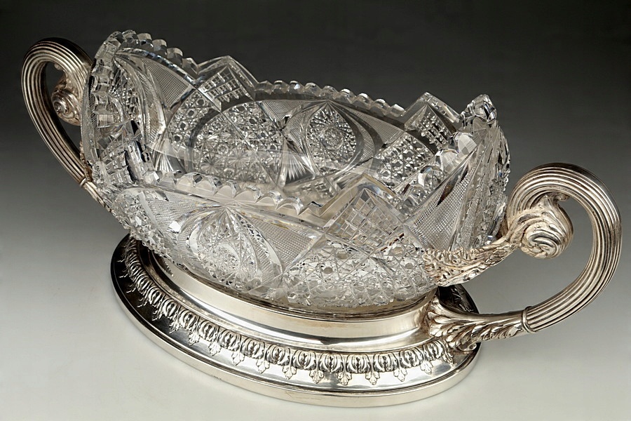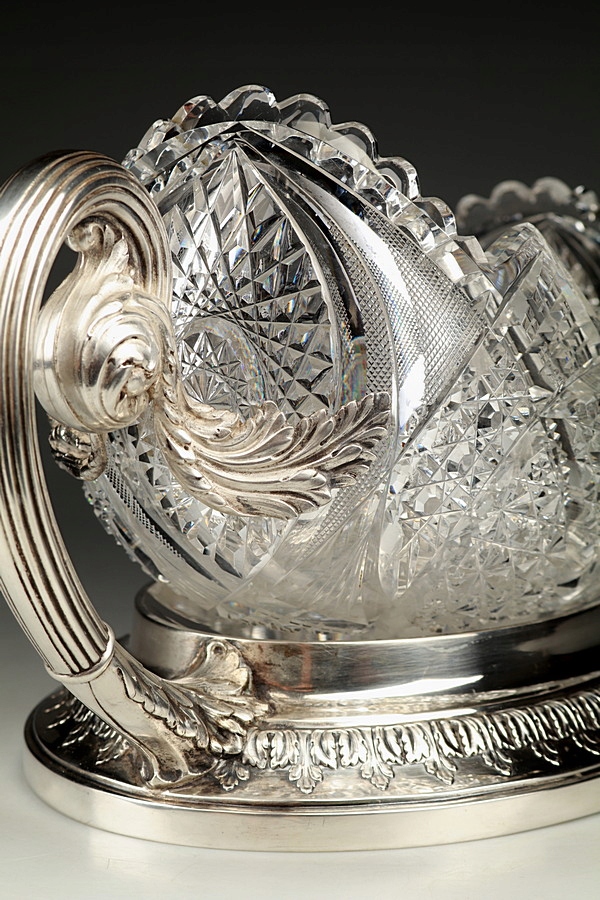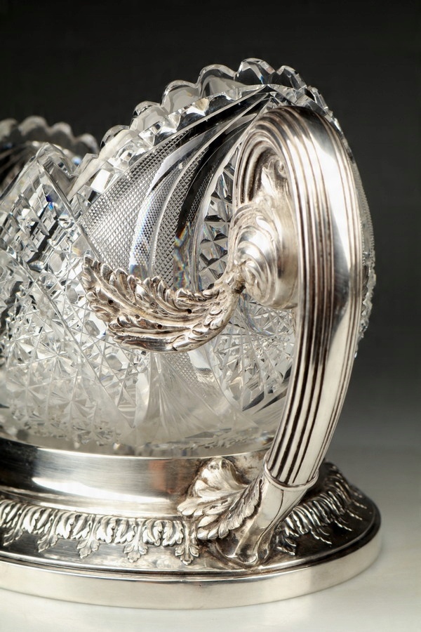 Большая серебряная жардиньерка с хрустальной вставкой. Серебро 84 пробы, вставка из хрусталя. Производство Германия, Бремен – Хемелинген, ювелирная мастерская М.Х. Компания Wilkens & Sohne основана в 1810 году.