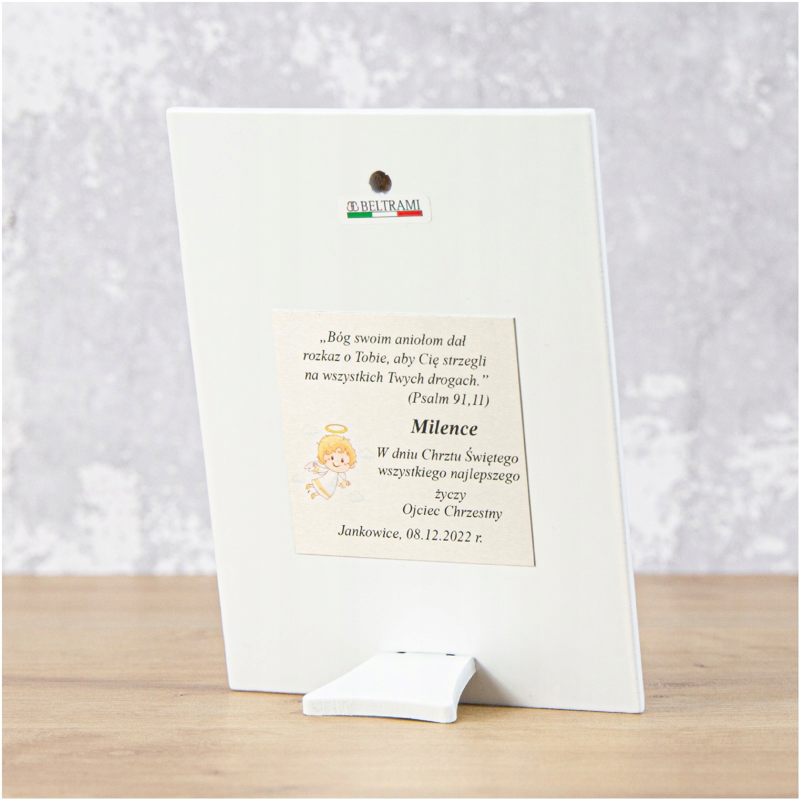 Картина с изображением Ангела-Хранителя с подписью – прекрасный подарок ко Святому Крещению. Качественное исполнение, изысканная отделка, элегантная упаковка - все это создает уникальный сувенир на долгие годы... Картина еще и чрезвычайно практична: у нее есть встроенная подставка, поэтому ее можно разместить на шкафу или комоде. или повесьте его на стену.