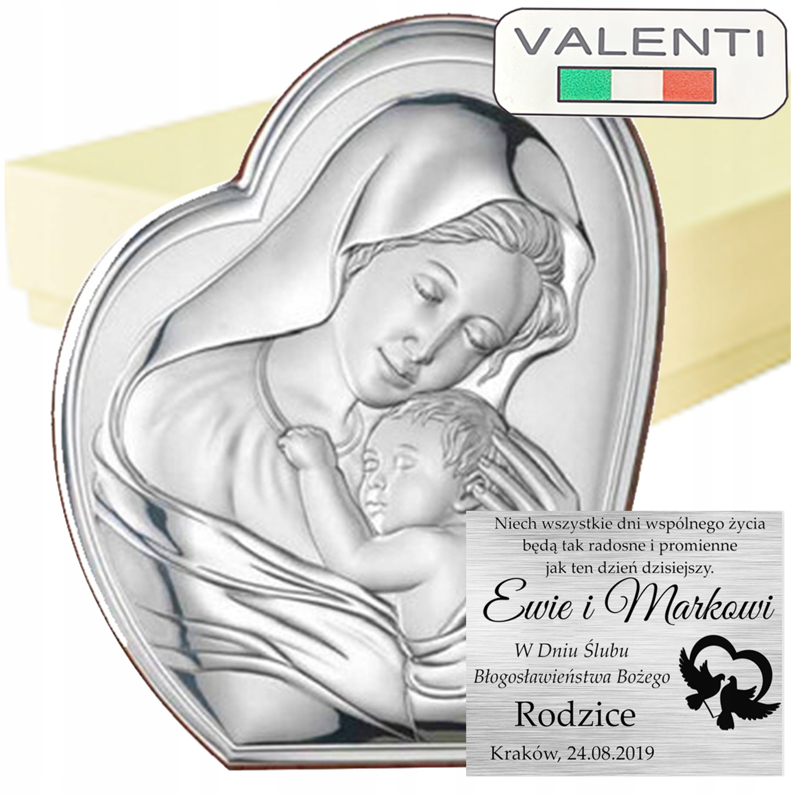 Серебряная священная картина итальянской компании VALENTI, передающая образ Богородицы с заботой и материнской любовью, заботящейся о мирно спящихМладенец Иисус. Все это было заключено в очаровательное половинчатое сердце. Дополнительным преимуществом является шикарная позолота, благодаря которой изображение выглядит богато и эксклюзивно. Задняя часть изготовлена из элегантного коричневого дерева высочайшего качества. Идеально подходит в качестве подарка на Свадьбу, Юбилей, Святое Крещение, Первое Святое Причастие, а также ко многим другим важным событиям, отмечающим торжественные и особенные моменты. Сувенир, предназначенный для размещения или подвешивания на стену, придаст элегантности и великолепия любому интерьеру. Благодаря личному посвящению, выполненному с помощью точной лазерной техники на серебряной или золотой пластине, оно не станет еще одним ненужным подарком, который быстро забудется.