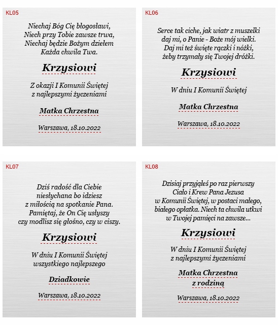 Вы можете выбрать один из шаблонов ниже, указав только выбранное число и данные (подчеркнутые красной линией) его следует изменить или вы можете отправить полностью свой текст. Вы также можете выбрать дизайн изображения, которое можно разместить рядом с содержимым посвящения. На выбор доступны 3 цвета тарелки: серебристый, белый и золотой. По умолчанию табличка выполнена в серебре.