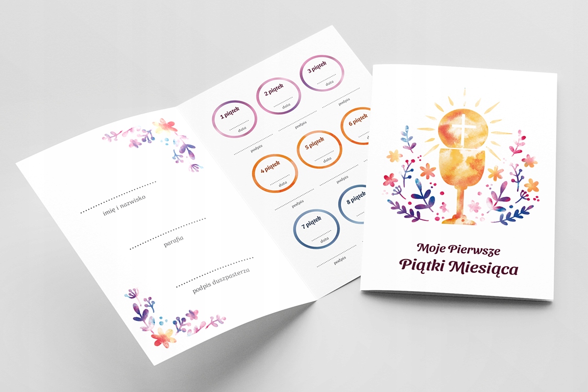 В комплекте вместе с картинкой вы получите бесплатно раскладывающуюся контрольную «Мои первые пятницы месяца» в виде небольшой удобной книжки. Размер 14,8 х 10,5 см (после складывания). Индикатор облегчит ребенку, принявшему Таинство Первого Причастия, совершение первых пятниц месяца, а сбор дальнейших подписей священника будет мотивировать его совершить этот уникальный религиозный ритуал.