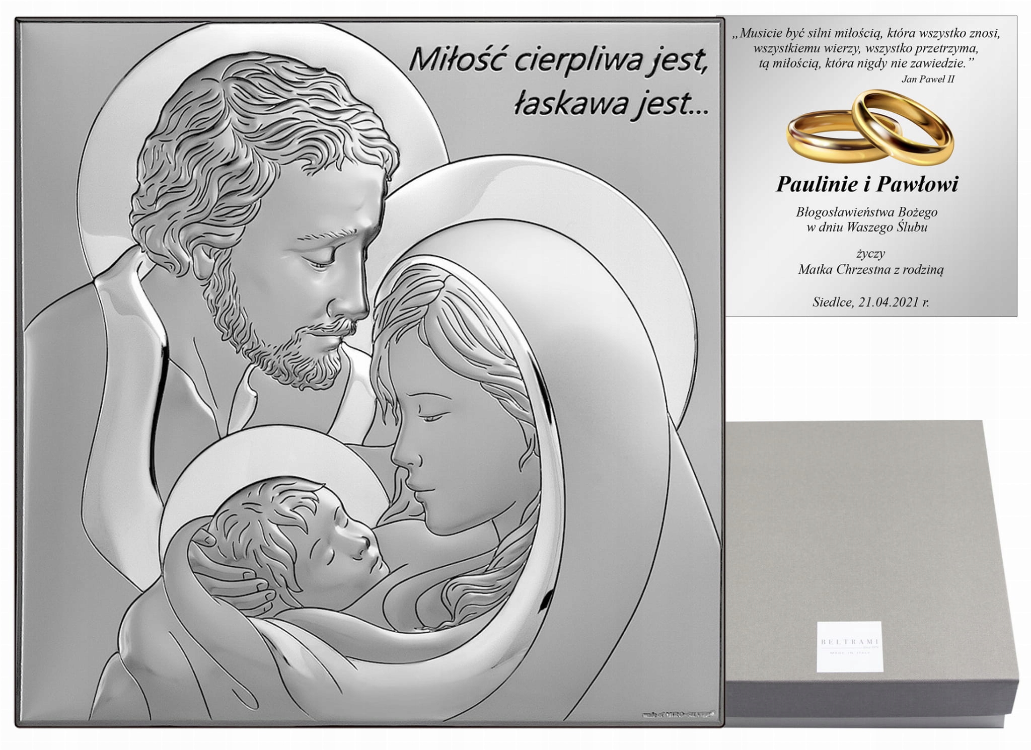 Картина с изображением Святого Семейства – прекрасный подарок на Свадьбу или Святое Крещение. Качественное исполнение, изысканная отделка, элегантная упаковка - все это создает уникальный сувенир на долгие годы... Картина еще и чрезвычайно практична: у нее есть встроенная подставка, поэтому ее можно разместить на шкафу или комоде. или повесьте его на стену.