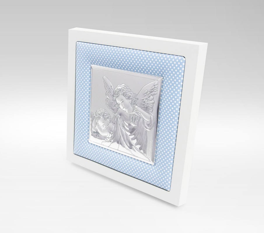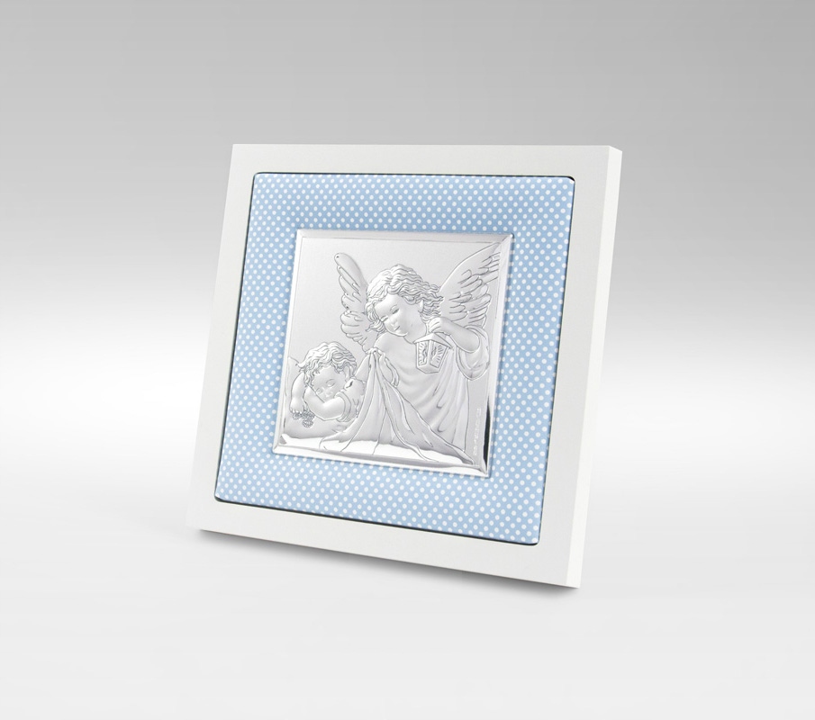 Серебряная картина на Крещение с изображением ангела с фонарем над спящим ребенком. Картина размещена на синей подушке.