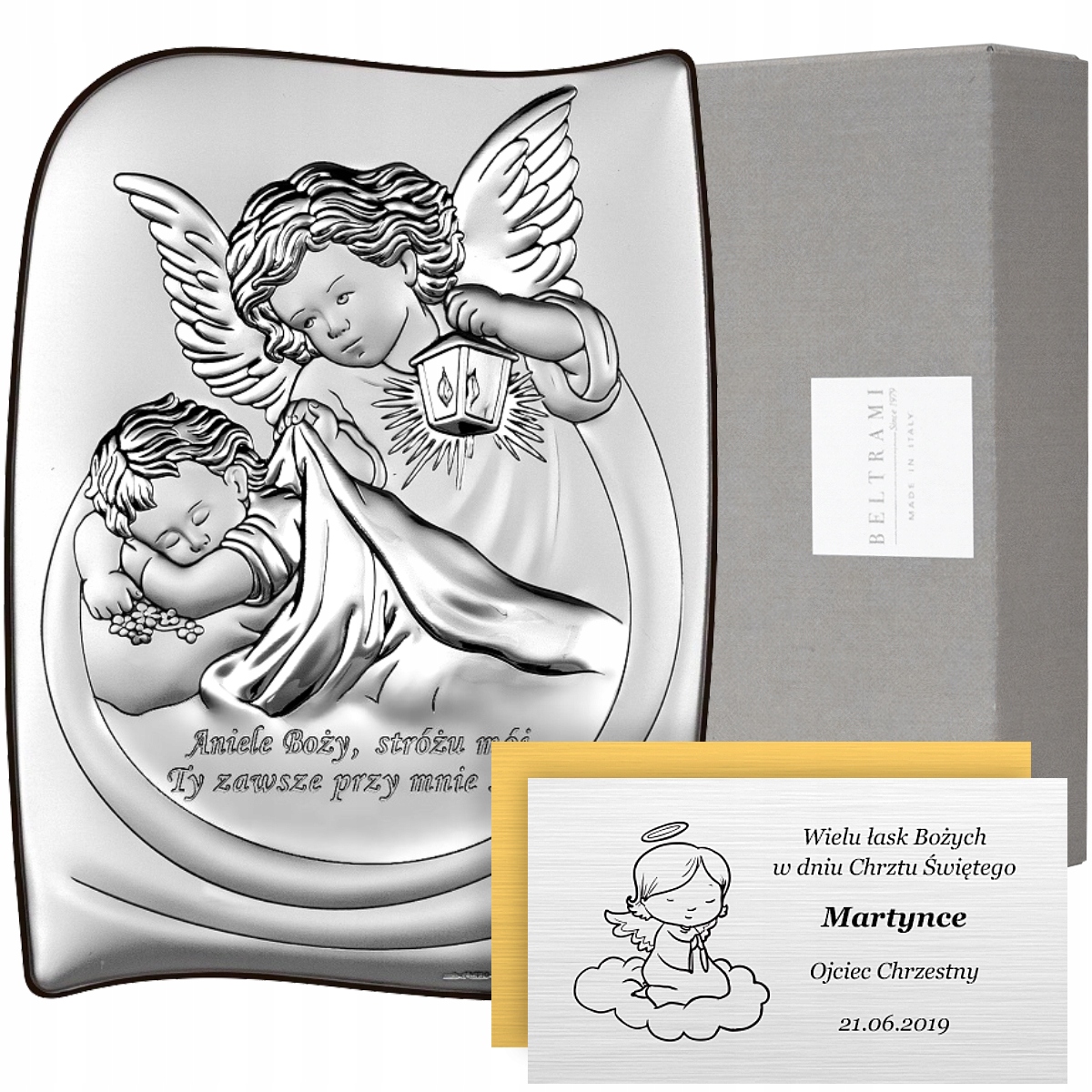 Серебряная картинка на крещение с изображением ангела с фонарем, склонившимся над спящим ребенком, и надписью «Ангел Божий, хранитель мой. Ты всегда стоишь» от меня."