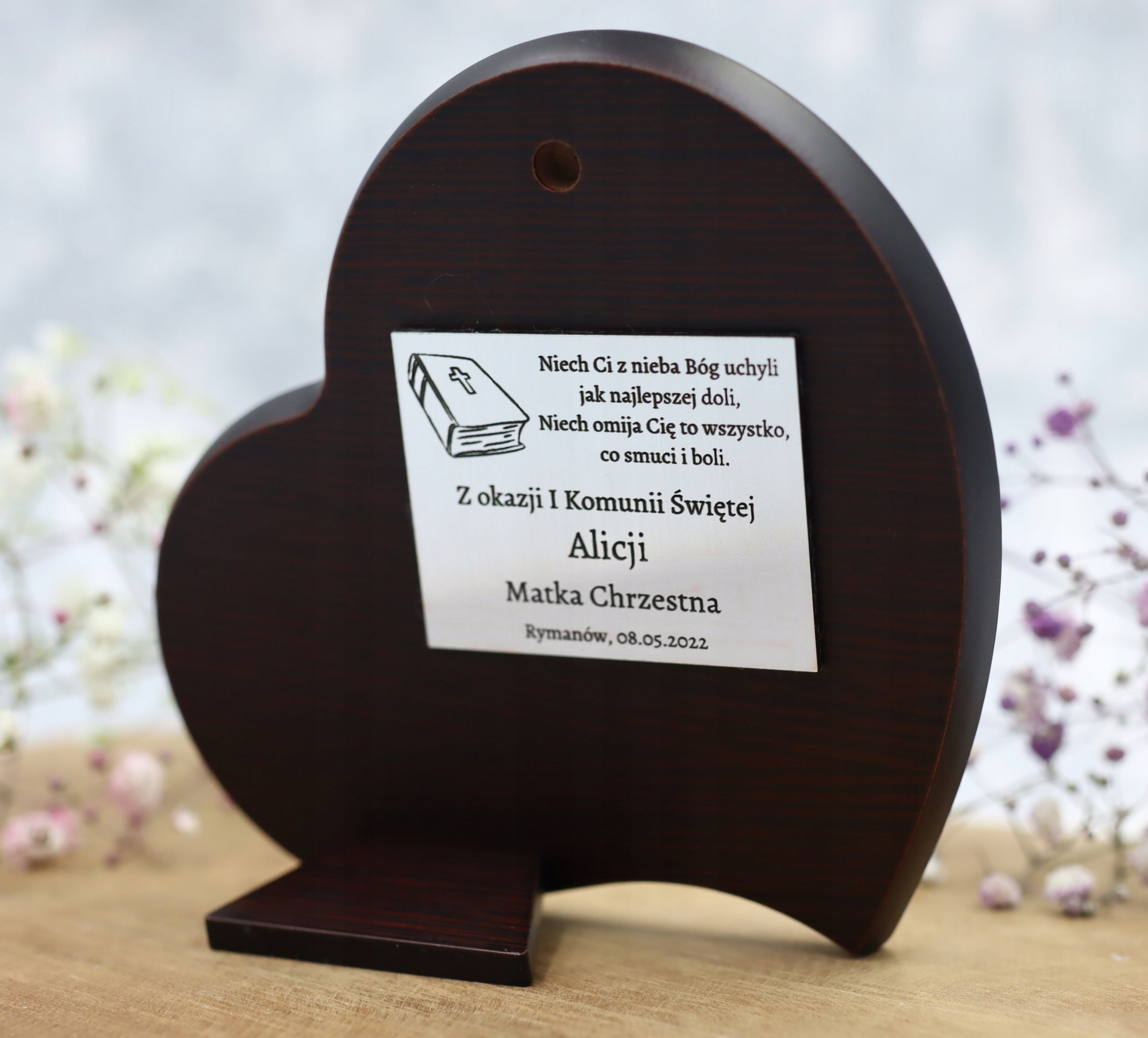 Сувенир от итальянской компании DONO с цветным изображением молящейся девушки. Вся вещь была закрыта в форме сердца с надписью внизу СУВЕНИР ПЕРВОГО СВЯТОГО ПРИЧАСТИЯ Картина крепилась на коричневое лакированное дерево. Благодаря вставленной подставке картину можно разместить на комоде или повесить на стену. Все выполнено из благородного сырья высочайшего качества, снабжено эстетичной упаковкой.