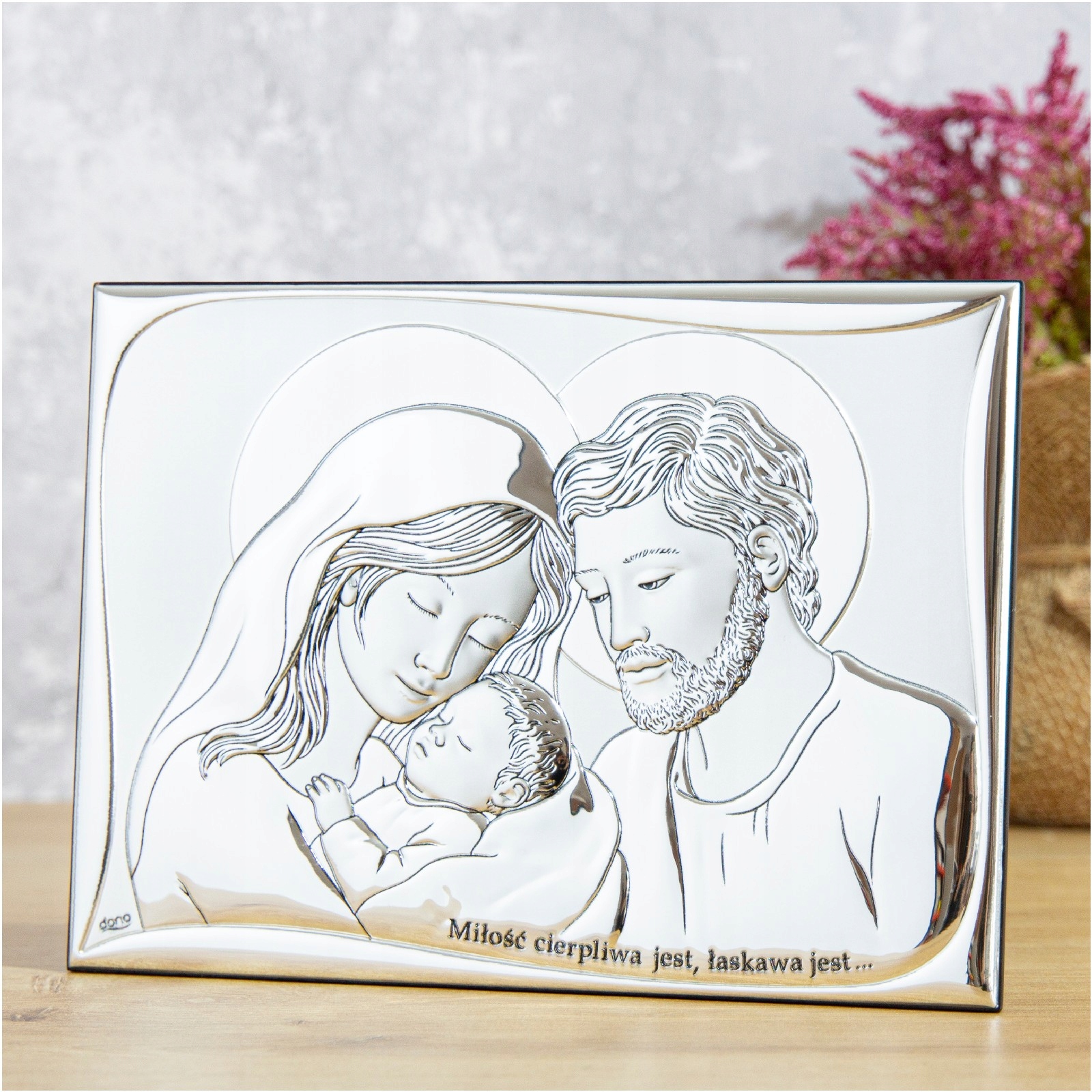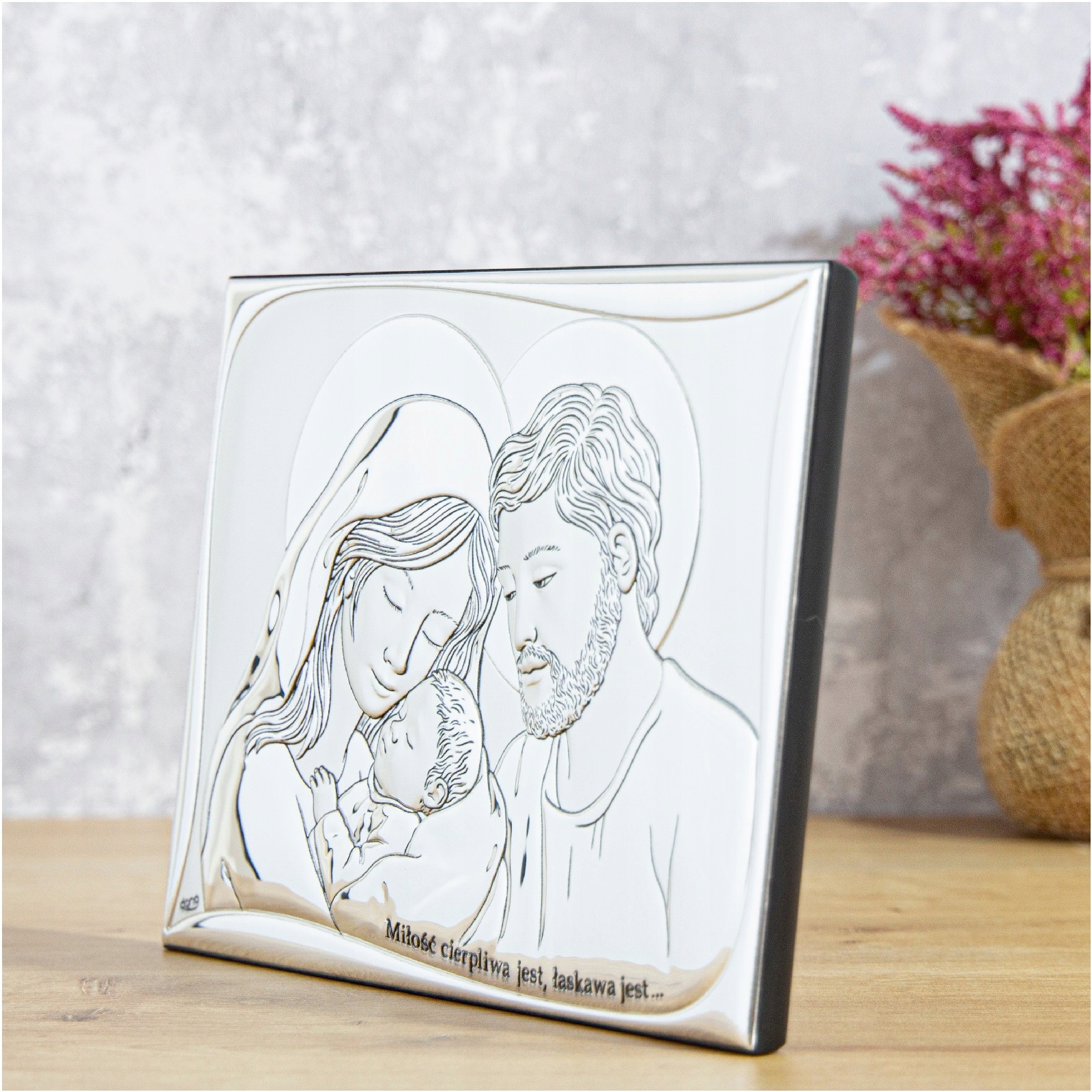 Картина с изображением Святого Семейства – прекрасный подарок на Свадьбу или Святое Крещение. Качественное исполнение, изысканная отделка, элегантная упаковка - все это создает уникальный сувенир на долгие годы... Картина еще и чрезвычайно практична: у нее есть встроенная подставка, поэтому ее можно разместить на шкафу или комоде. или повесьте его на стену.