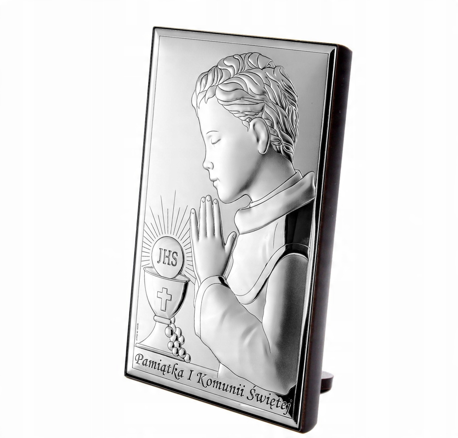 сувенир итальянской компании valenti b> с изображением молящего мальчика. В целом было закрыто в форме прямоугольника с надписью в нижней части воспоминания о первом святом причастии. картина была встроена в коричневую лаку из дерева. Благодаря вставленной поддержке изображение можно пометить на комод или повесить на стену. В целом изготовлено из драгоценного сырья самого высокого качества, несущего эстетическую упаковку. Древесина и серебро высочайшего качества. Для производства используется инновационный драгоценный металл, называемый Miro-Silver. Дополнительная защита в виде особого лака придает уверенность в том, что картина будет отражать свет и выглядеть красиво. Специальный клейкий слой, соединяющий картину с деревом, гарантирует долговечность в течение многих лет. Весь выполнение продукта подтверждается качественным сертификатом, прикрепленным к продукту