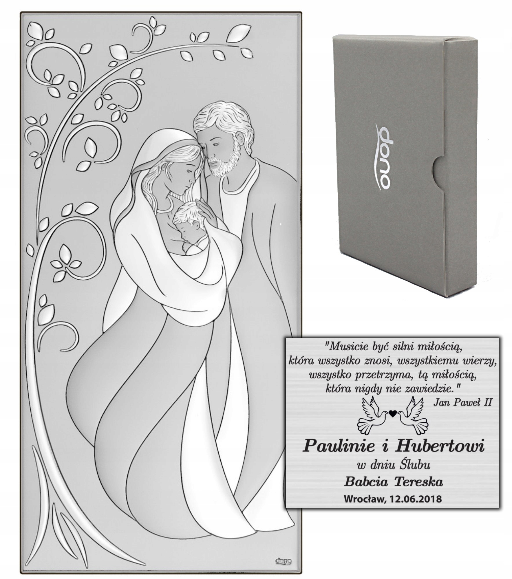 Сувенир от итальянской компании DONO с изображением Святого Семейства. Все это было заключено в прямоугольную форму и украшено древом жизни. Картина закреплена на дереве, покрытом коричневым лаком. Благодаря вставленной подставке картину можно разместить на комоде или повесить на стену. Все изготовлено из благородных материалов высочайшего качества, снабжено эстетичной упаковкой.