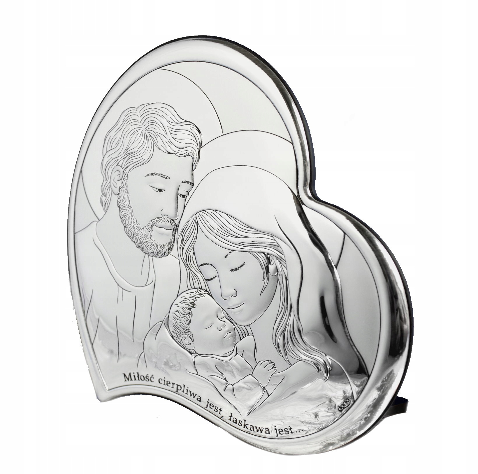 Сувенир от итальянской компании BELTRAMI, представляющий Святое Семейство. Святое Семейство представлено как образец христианской семьи – совершеннейшего союза сердец. Он символизирует вечный союз людей, воспитывающий добрые семейные отношения, основанные на смирении, терпении и взаимном прощении. Картина была закреплена на лакированном коричневом дереве с подписью "Любовь терпелива, добра...". Прекрасный подарок к таинству бракосочетания, счастливым родителям новорожденного ребенка, крещению.