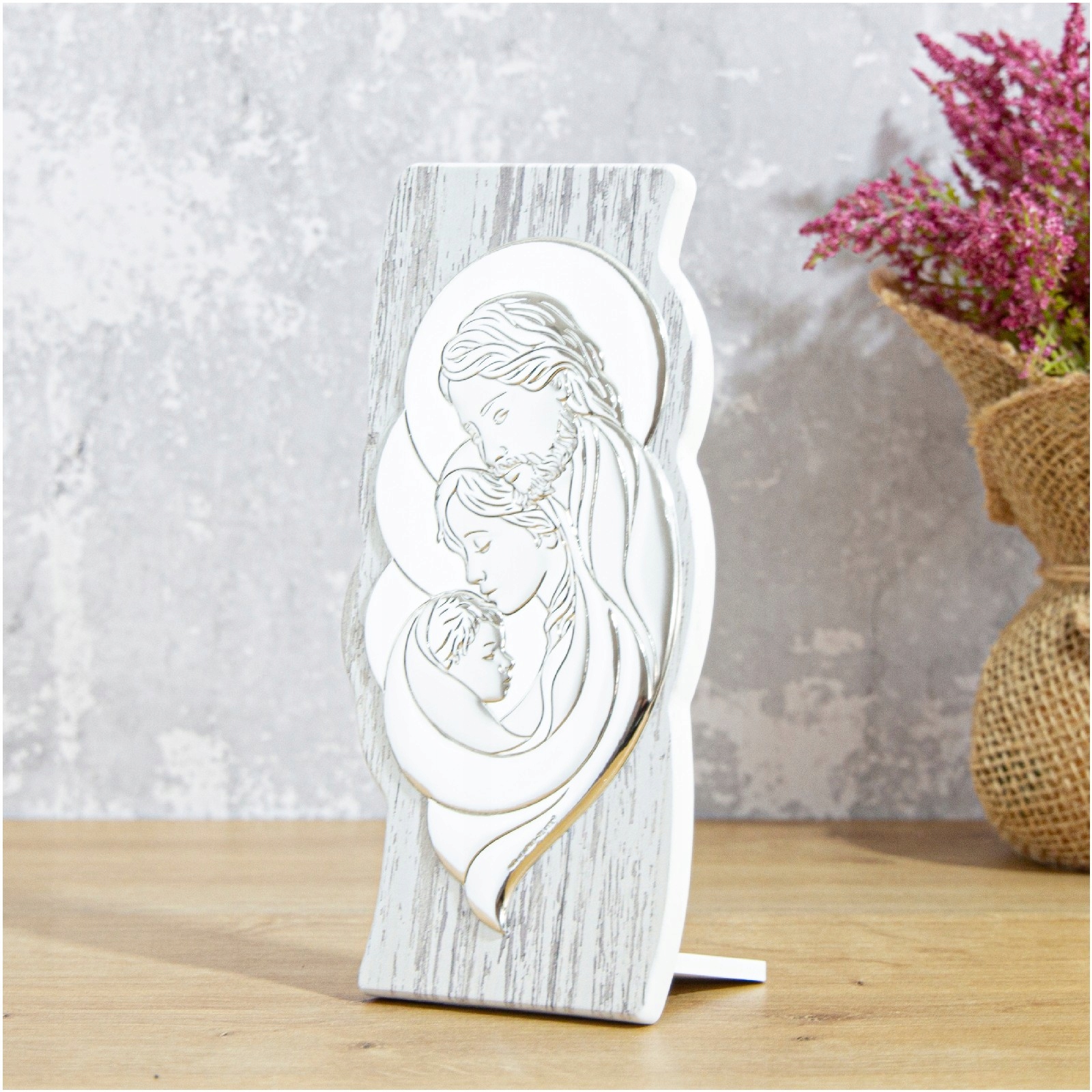 Картина с изображением Святого Семейства – прекрасный подарок на свадьбу, крещение, причастие, юбилей или благодарственный подарок родителям. Высокое качество исполнения, изысканная отделка, элегантная упаковка - все это создает уникальный сувенир на долгие годы... Картина еще и чрезвычайно практична: у нее есть встроенная подставка, поэтому ее можно разместить на шкафу или комоде. или повесьте его на стену.