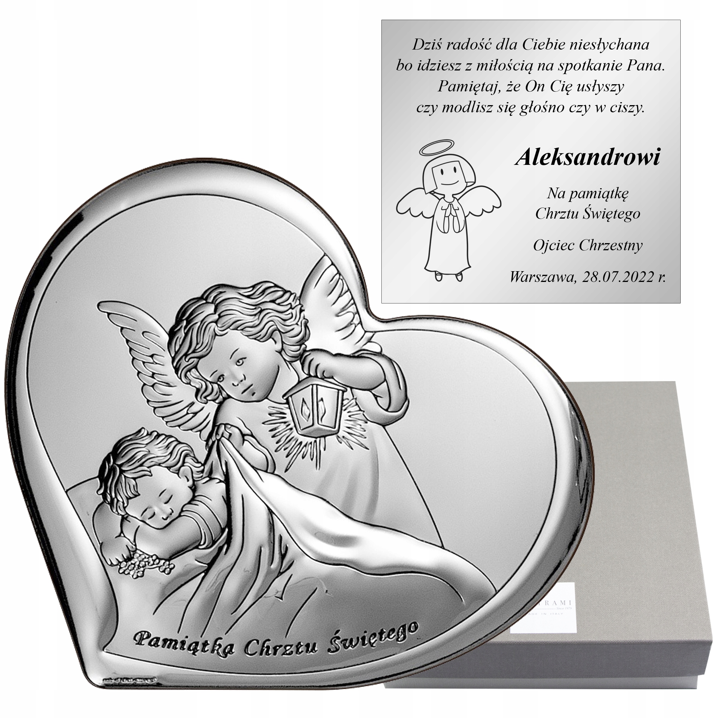 Картина с изображением Ангела-Хранителя с фонариком в форме сердца – прекрасный подарок ко Святому Крещению. Высокое качество изготовления, изысканная отделка, элегантная упаковка - все это создает уникальный сувенир на долгие годы... Картина еще и чрезвычайно практична: у нее есть вставная подставка, поэтому ее можно разместить на шкафу или комоде или повесить. на стене.