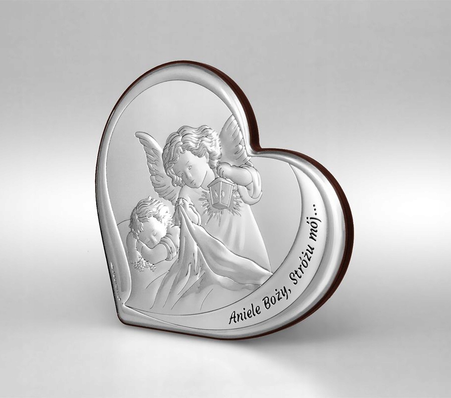 Серебряная картинка на крещение с изображением ангела с фонарем, склонившимся над спящим ребенком, и надписью «Ангел Божий, Хранитель мой...» .