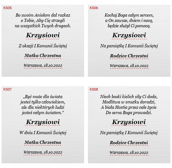 Вы можете выбрать один из шаблонов ниже, указав только выбранное число и данные (подчеркнутые красной линией) его следует изменить или вы можете отправить полностью свой текст. Вы также можете выбрать дизайн изображения, которое можно разместить рядом с содержимым посвящения. На выбор предлагаются 3 цвета пластин: серебро, белый и золотой. По умолчанию табличка выполнена в серебре.